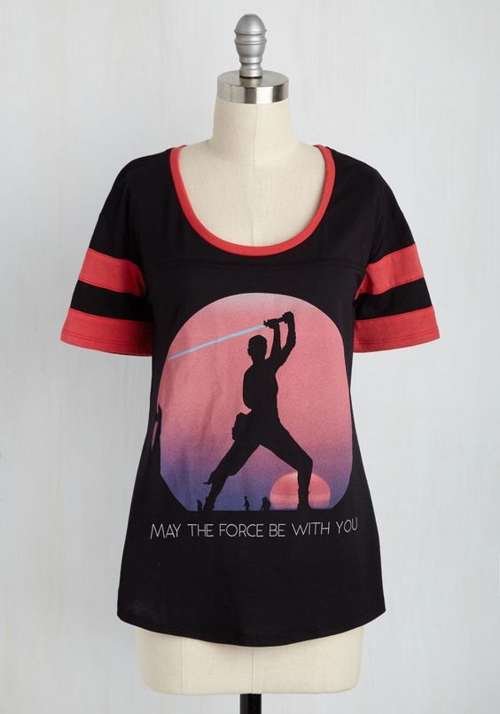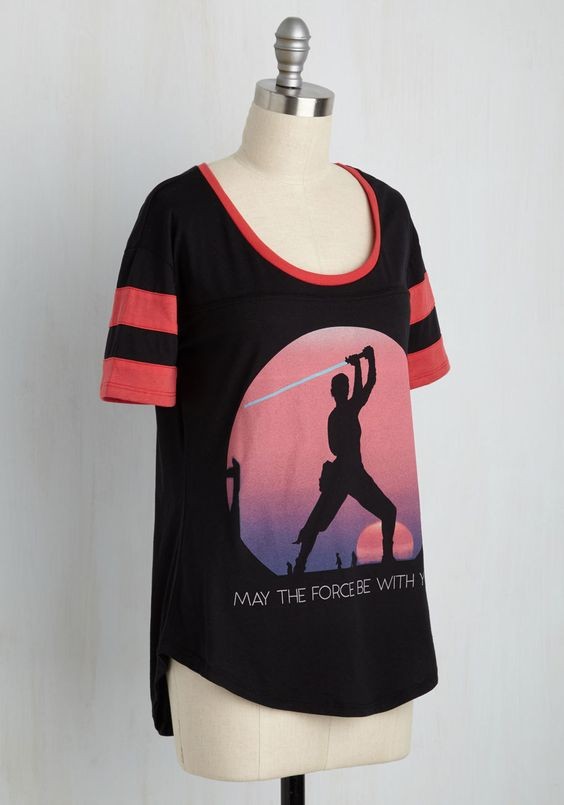 ModCloth has a new women’s Rey t-shirt available. The black t-shirt features two pinkish-red contrast stripes on each sleeve, and contrast neckline binding. The front print is a silhouette of Rey with a lightsaber against a Jakku sunset, with the text ‘May The Force Be With You’ underneath. Priced at US$34.99 each, the t-shirt is available in sizes S to XXL – ModCloth can ship internationally.