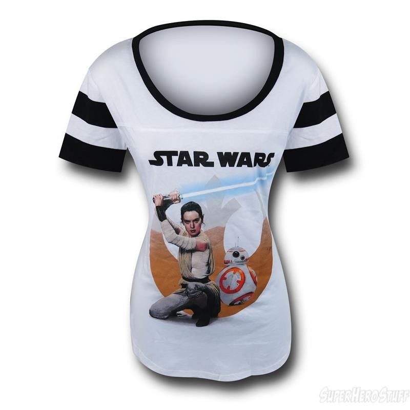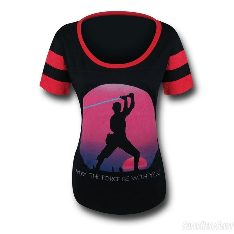 SuperHeroStuff has two new women’s The Force Awakens t-shirts available – both feature Rey! The first is a white t-shirt with contrasting black stripes on the sleeves, and a front print of Rey and BB-8 against the Resistance ‘starbird’ logo and Star Wars logo. The second is a black t-shirt with contrasting red (possibly more pink toned?) stripes on the sleeves, and a front print of Rey’s silhouette against a Jakku sunset with the text ‘May The Force Be With You’ underneath. I can’t decide which design I like better!