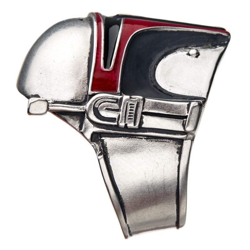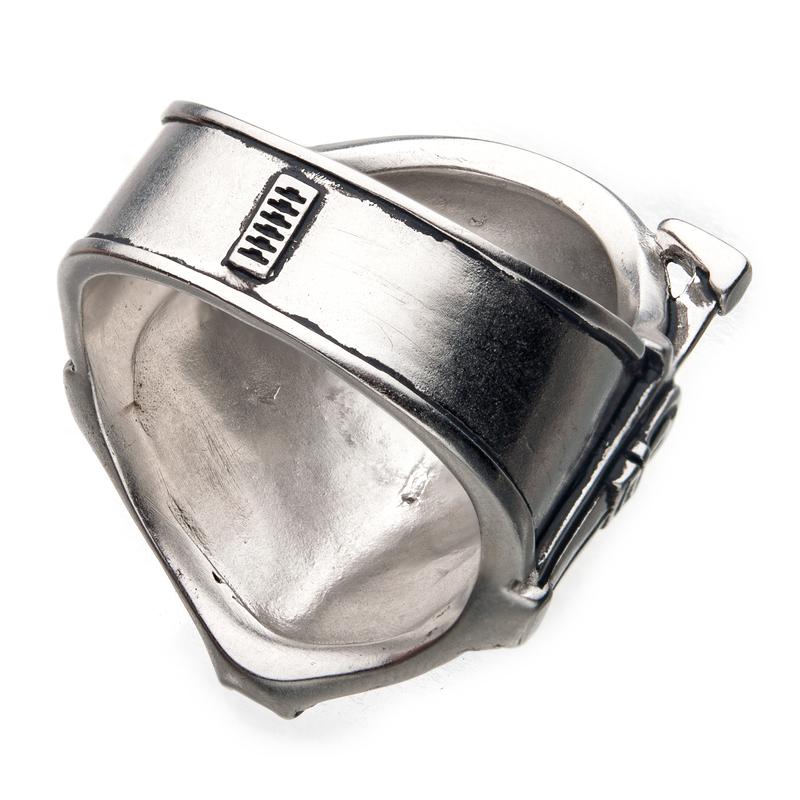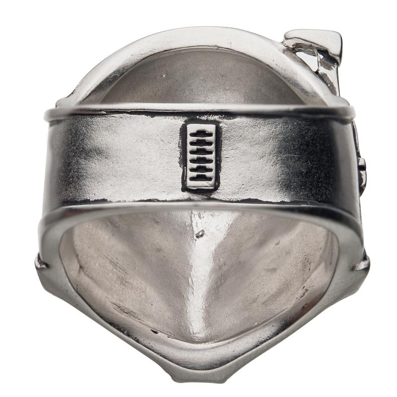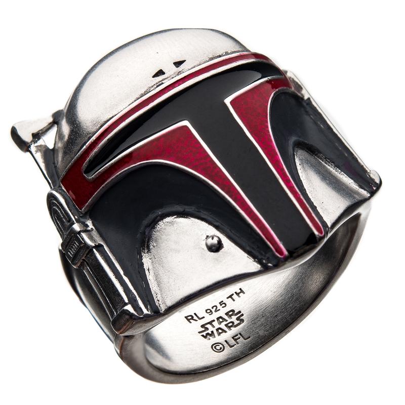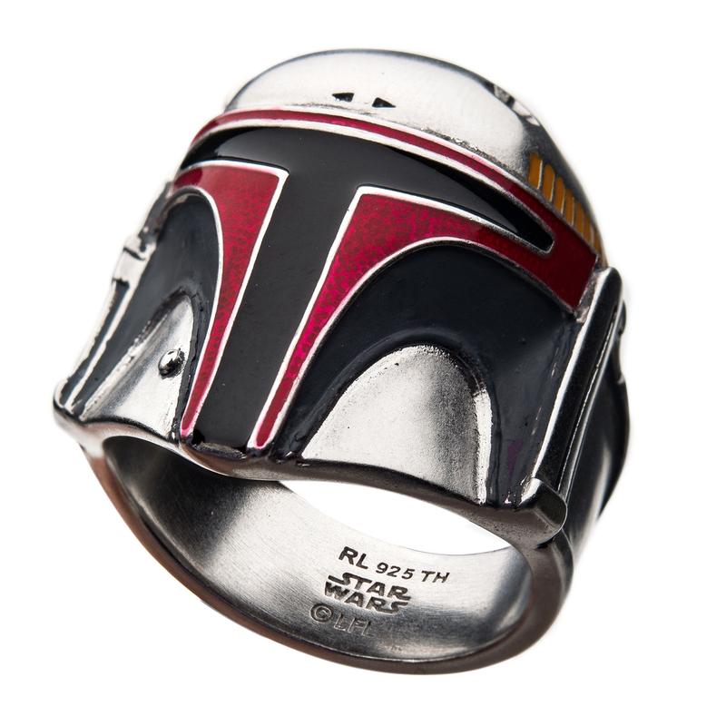 Sculpted in solid sterling silver, the Boba Fett Ring depicts the helmet of the galaxy’s most feared bounty hunter. Premium hand-painted enamel and antiquing accentuate Boba Fett’s customized Mandalorian helmet with recognizable dent. This large three-dimensional ring is durable and comfortable for everyday wear.