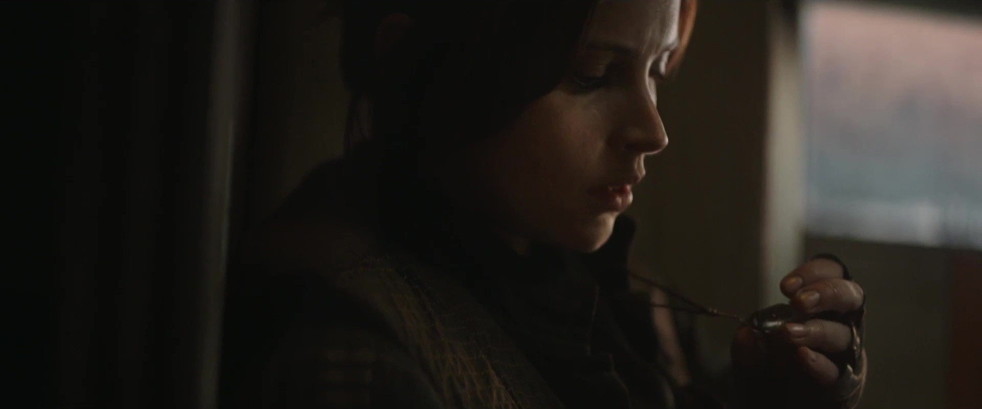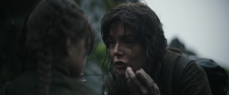 A new international trailer for Rogue One has been released, which reveals Jyn Erso’s necklace! It looks like her mother gives her the crystal necklace when Jyn is a young girl. The crystal appears to have markings/writing down the side – though it’s too hard to make out clearly what it says.