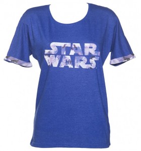 Blue dolman ladies t-shirt with a floral Star Wars logo and sleeve details, priced at £31.99 (approximately US$50) – buy here