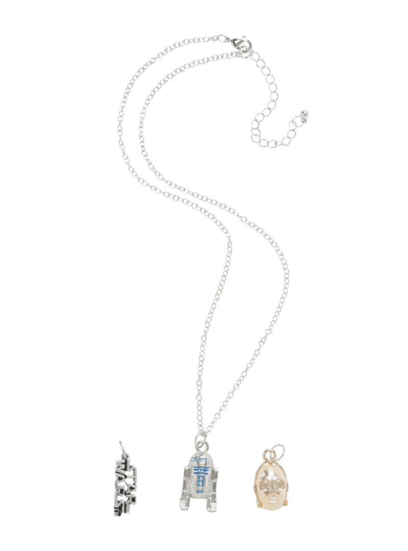 Silver tone chain necklace from Star Wars with interchangeable charms that allow you to update your style on the reg. Interchangeable charms feature three metal designs including C-3PO, R2-D2 & Star Wars logo.