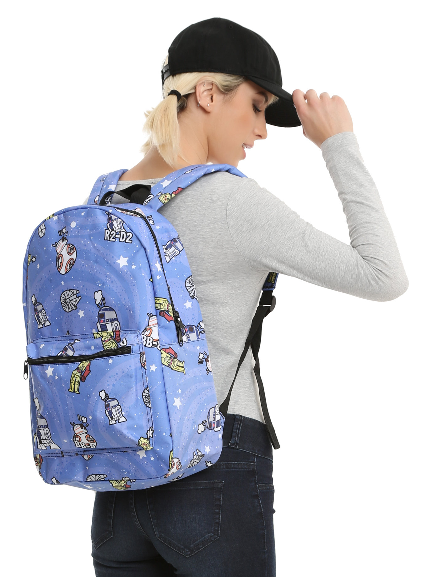 This cute new Star Wars The Force Awakens Droids backpack is now available at Hot Topic. Made from 100% polyester canvas, the blue backpack features a cute print of R2-D2, C-3PO (with red arm), BB-8, and the Millennium Falcon.