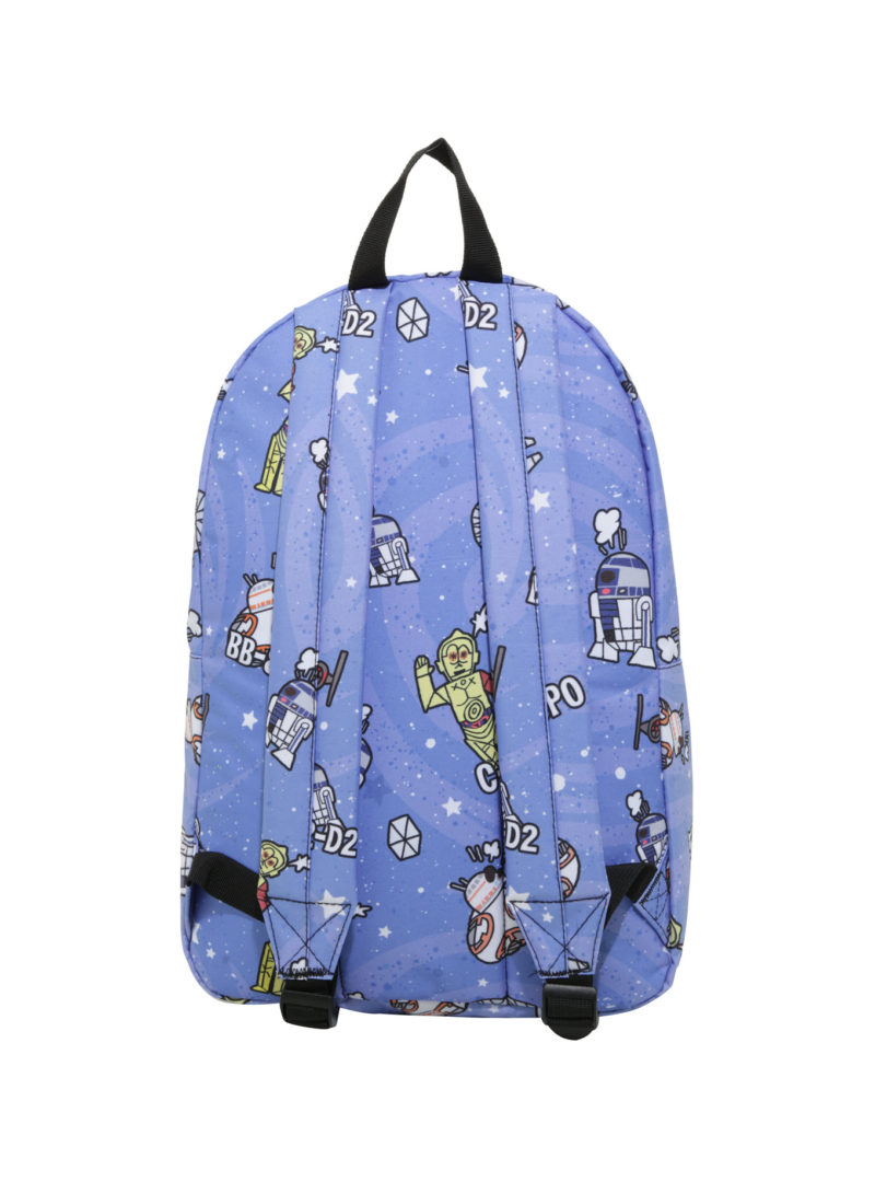 Are these the droids you are looking for? Of course they are! R2-D2, C-3PO & BB-8 get tossed around on this galactic blue canvas backpack from Star Wars. The Millennium Falcon is flying around in the stars as well! Details include a padded back & adjustable straps, front zipper pouch pocket and a zipper closure.