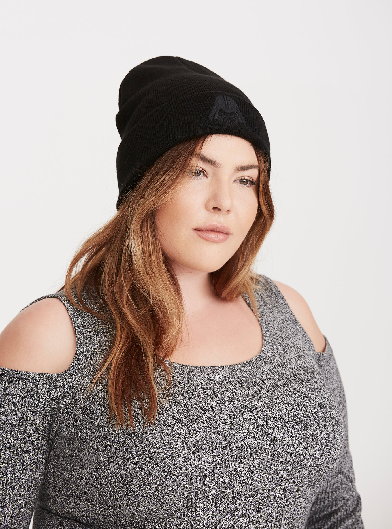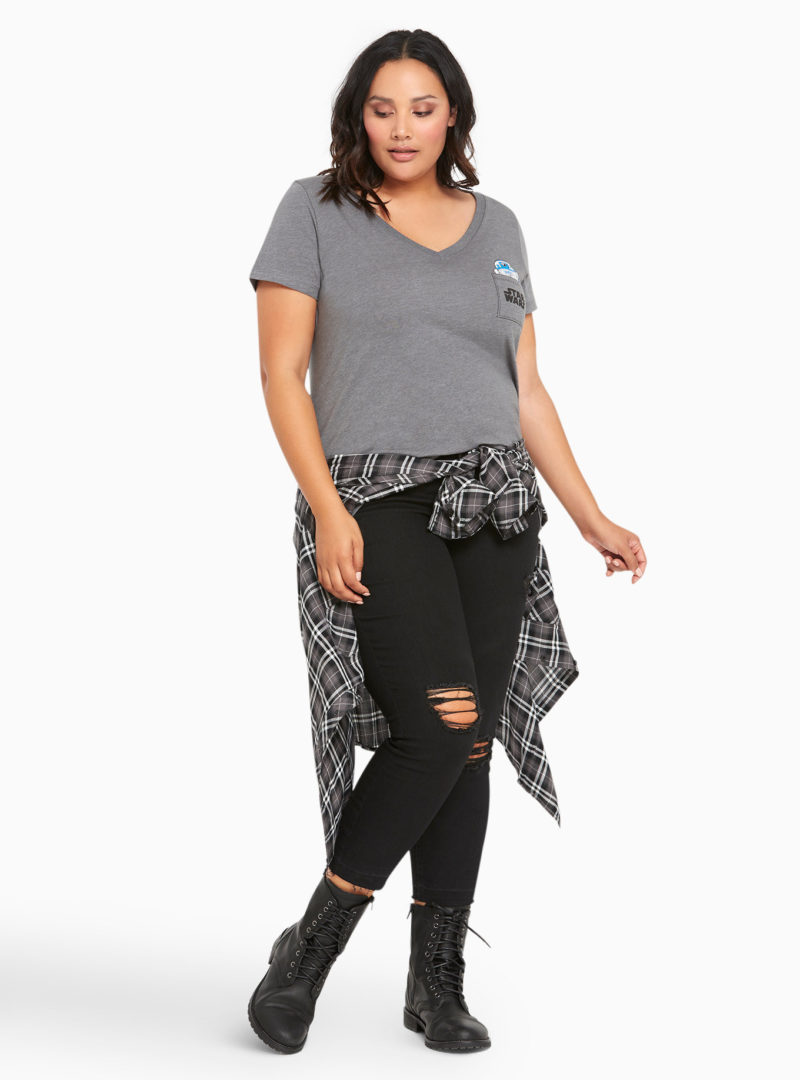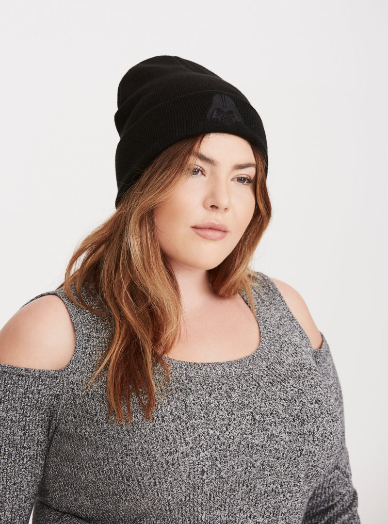 New arrivals at Torrid include 2 women’s Star Wars items. The first is a grey v-neck t-shirt, which features a printed pocket on the upper left chest, with R2-D2 poking out. The second new item is a black knitted beanie with an embroidered Darth Vader mask on the front cuff.