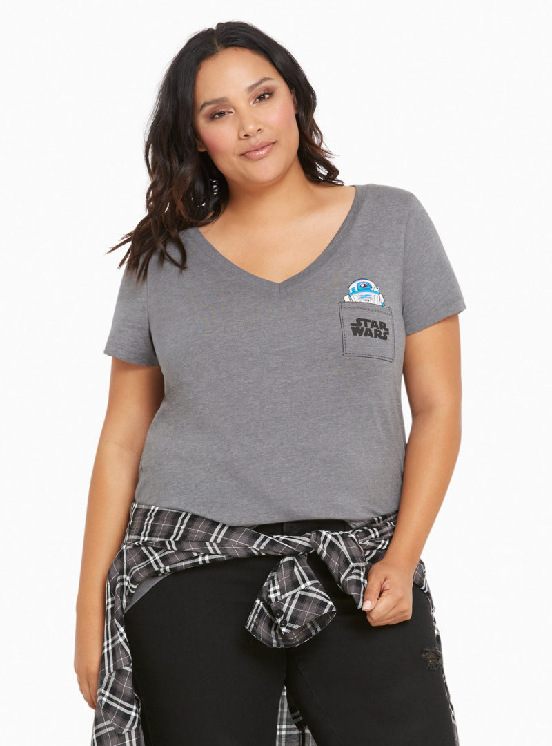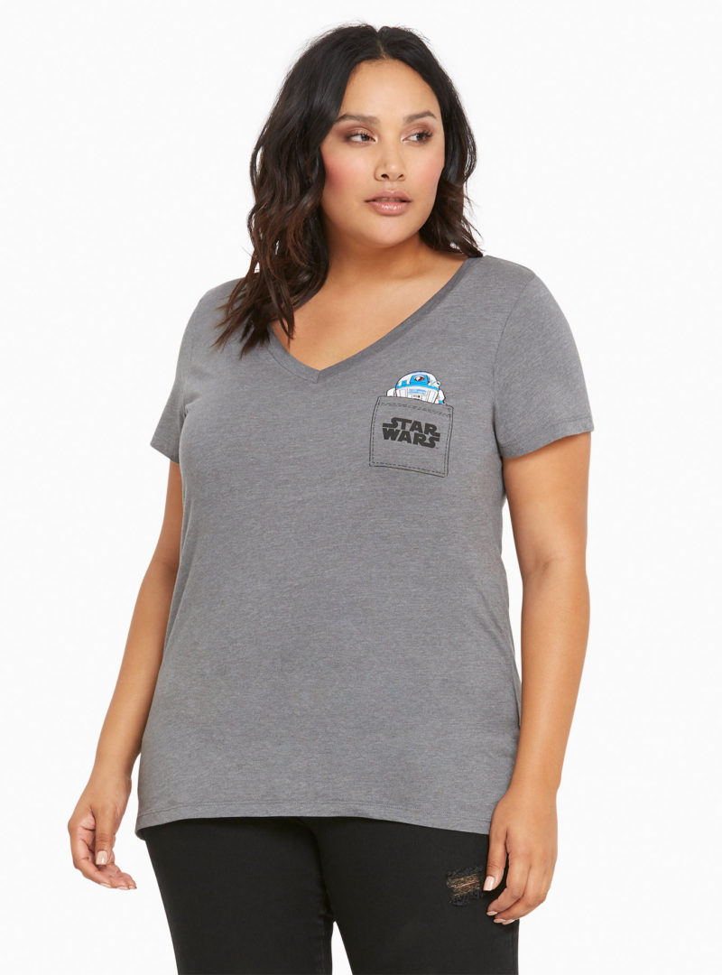 - Women’s R2-D2 pocket v-neck tee – US$34.90 each – plus sizes 00 to 6