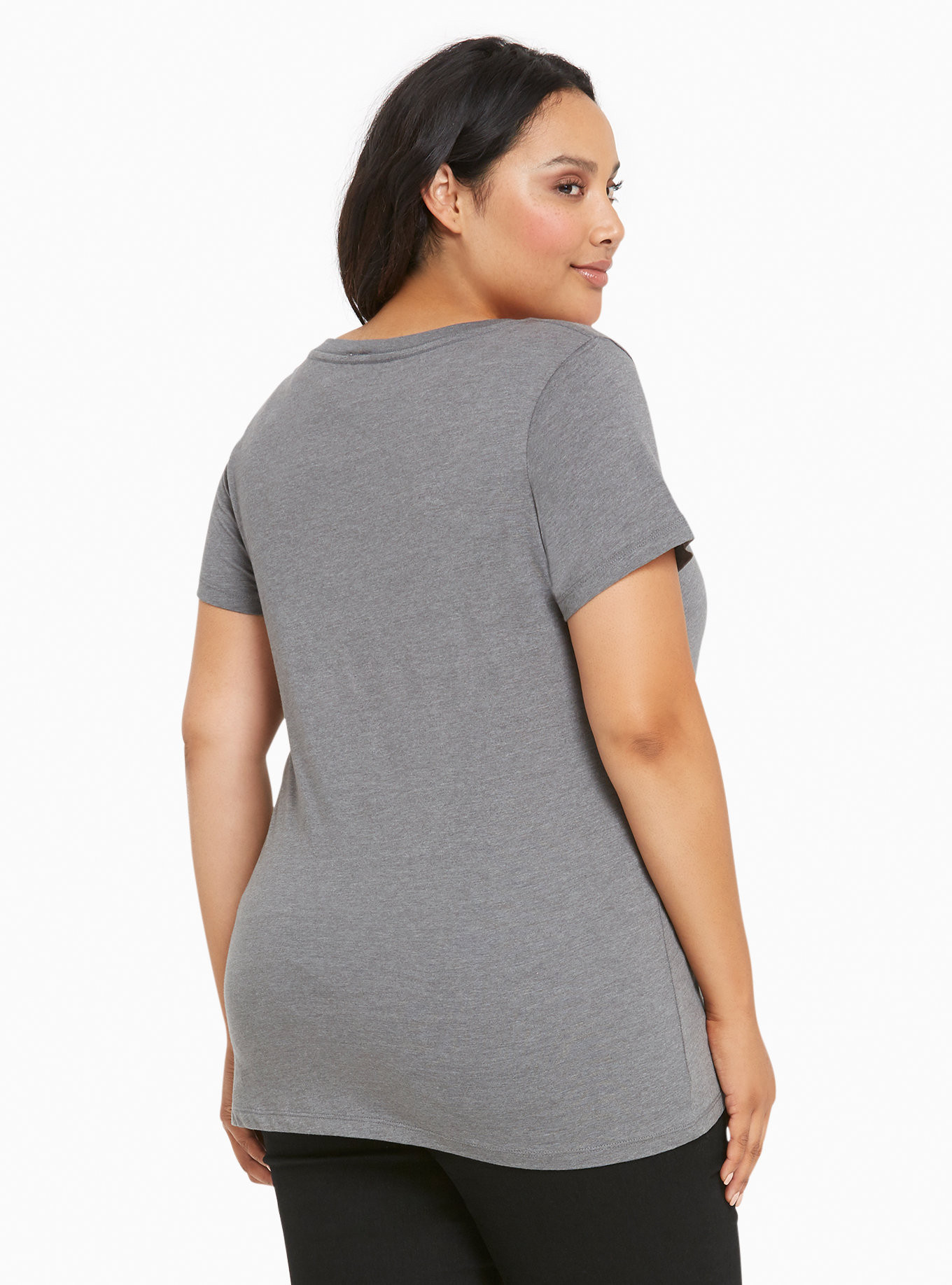 This is the droid tee you’ve been looking for! The grey knit v-neck style is totally chill with a laidback fit, while the faux “Star Wars” pocket beep-bops into our hearts with an R2D2 graphic.