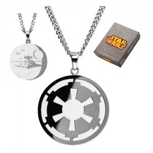 Pendant designs – 3d stormtrooper, gold plated rebel alliance, stormtrooper typography, Darth Vader etched, 3d Darth Vader, Mandalorian symbol, Darth Vader mirrored, 3d Chewbacca, 3d Boba Fett, R2-D2 typography, Imperial symbol/Death Star etched, Chewbacca etched, Imperial symbol gun metal, stormtrooper, Imperial symbol cut out, poster, AT-AT Walker, X1 TIE Fighter