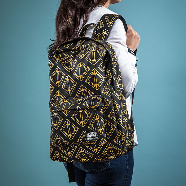 These new Loungefly x Star Wars The Last Jedi backpacks are now available at ThinkGeek. Choose from Resistance or First Order themed designs, each with an Art Deco style repeating print. The X-Wing Fighter backpack is exclusive to ThinkGeek – I really love that black and gold design!