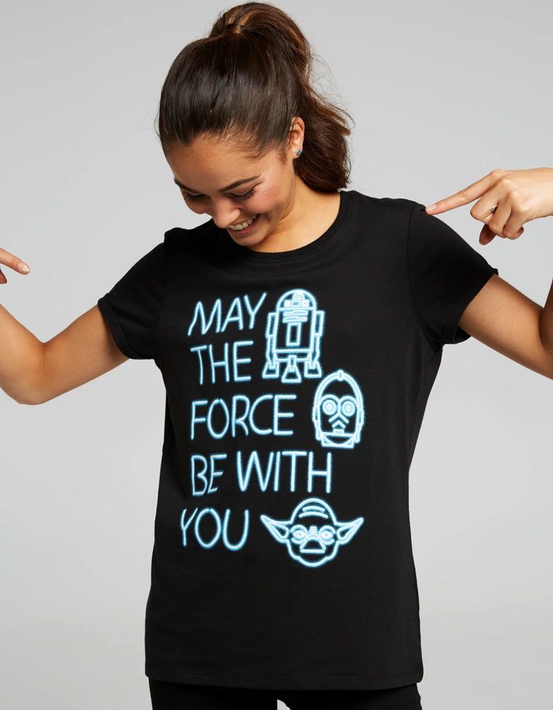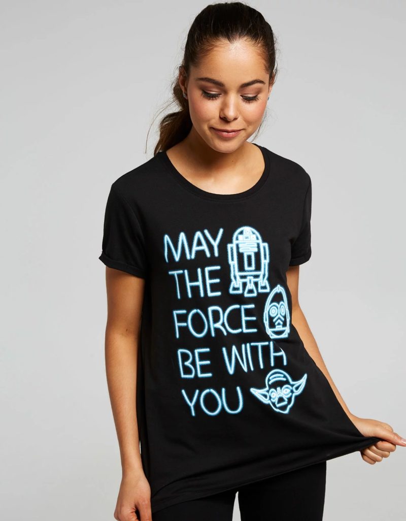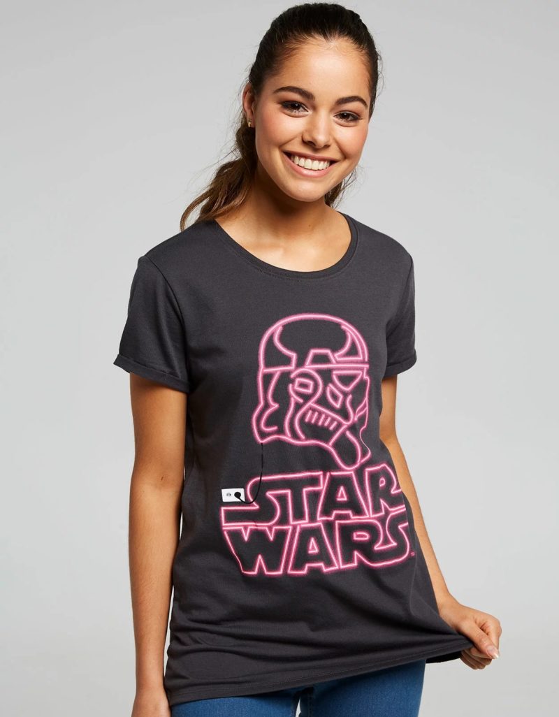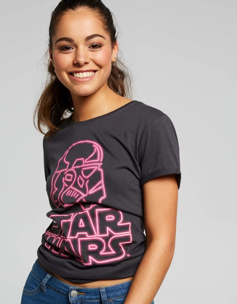Australia/New Zealand based store Jay Jays has 2 new women’s Star Wars t-shirts available. The first is a charcoal grey t-shirt with a pink neon print of a Stormtrooper helmet with the Star Wars logo, while the second is a black t-shirt with a blue neon print of the classic Star Wars quote ‘May The Force Be With You’, alongside little images of R2-D2, C-3PO, and Yoda. Both shirts are made from 100% cotton.