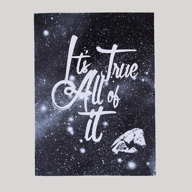 Han Solo’s quote “It’s True / All of it” on a starfield with the Millennium Falcon is printed on the front of this 50% cotton / 50% polyester silver ladies’ plus size shirt.