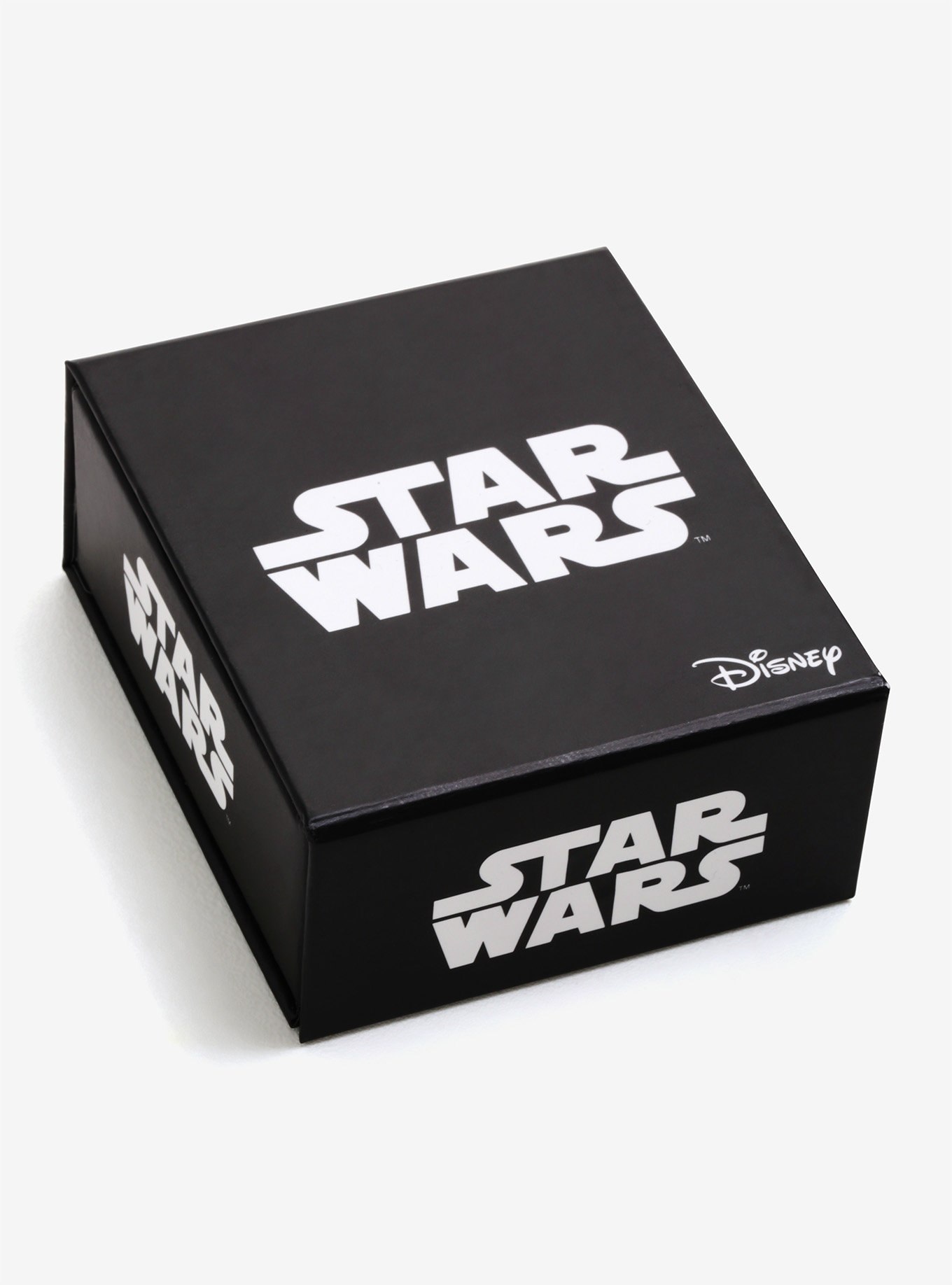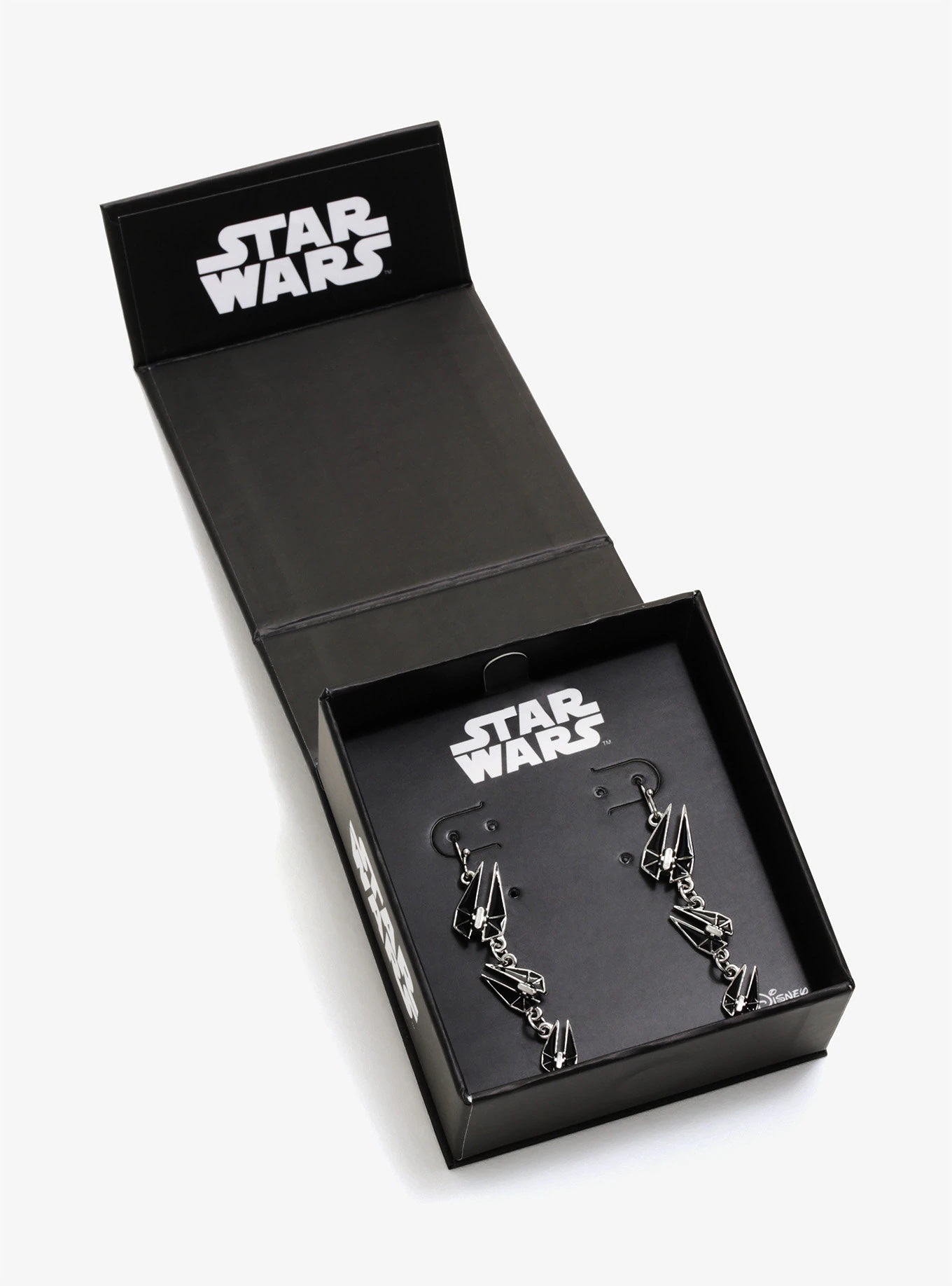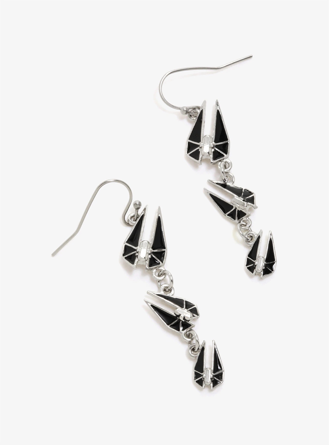 These Star Wars starfighter dangle earrings are available at Box Lunch. The silver-tone hook earings each feature three dangling Imperial starfighter charms, connected in a line. The charms are accented with black enamel on the wings. A great accessory for any Imperial themed outfit!