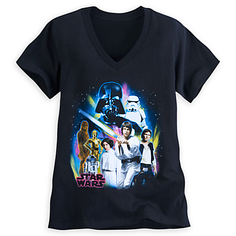 The Disney Store has added a new women’s Star Wars t-shirt to their website. The v-neck t-shirt features a colourful ‘classic cast’ print of characters from A New Hope. Available in sizes XS to XXL, the t-shirt is priced at US$19.99 – this shirt is included in the current promotion of ‘buy adult tees for $15 each when you buy 2 or more’. Disney Store can ship internationally, which is great.