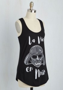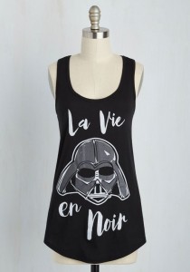 ModCloth has a new women’s Star Wars tank top available. The black racerback tank top features a front print of Darth Vader, with French text ‘La Vie En Noir’ – which translates to ‘Live In Black’. Priced at US$34.99 each, the tank top is available in sizes S to XXL – ModCloth can ship internationally. I just love the print of this top, I haven’t seen it used on women’s apparel before.