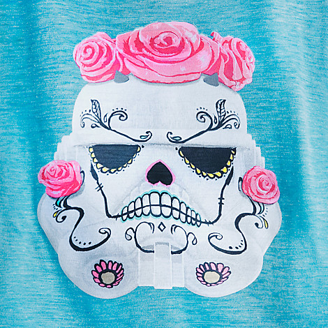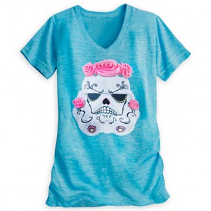 Originally available at the recent D23 Expo, this women’s Stormtrooper t-shirt is now available on-line at the Disney Store. The women’s blue v-neck t-shirt features a print of a ‘Dia De Los Muertos’ style decorated Stormtrooper helmet. Originally available in sizes XS to XXL, currently only sizes S, L and XL are in stock (as this is probably left over stock from the expo), priced at US$24.95 each – the Disney Store can ship internationally.