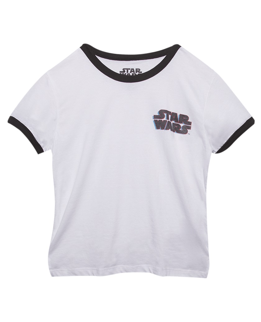Wet Seal has added a new women’s Star Wars t-shirt to their website. The white ringer t-shirt features contrast black trim at the neckline and sleeves, with the Star Wars logo printed on the front. Available in sizes XS to XL, it is priced at US$21.90 each. Wet Seal has a current promotion of ‘buy 1, get 1 50% off’ on graphic tees – they currently have two other women’s Star Wars tops in stock. Unfortunately Wet Seal does not ship outside the US, so international customers can only purchase via a mail redirection service.