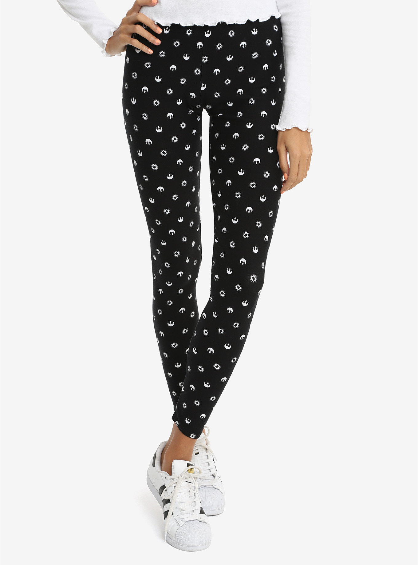 Dark Side? Or Light Side? Why not both? These black leggings have an allover print of the Rebel and Imperial emblems.