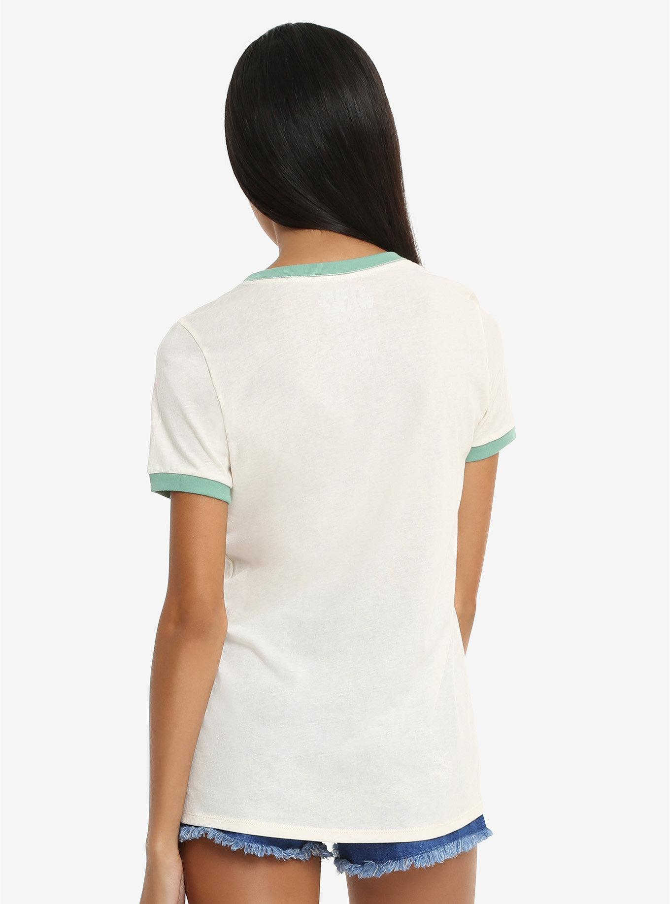 This cream colored ringer tee is worth celebrating, so start singing! This super soft ringer has olive green detailing and features an Ewok line drawing over the words ‘nub nub’.
