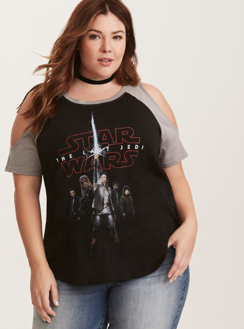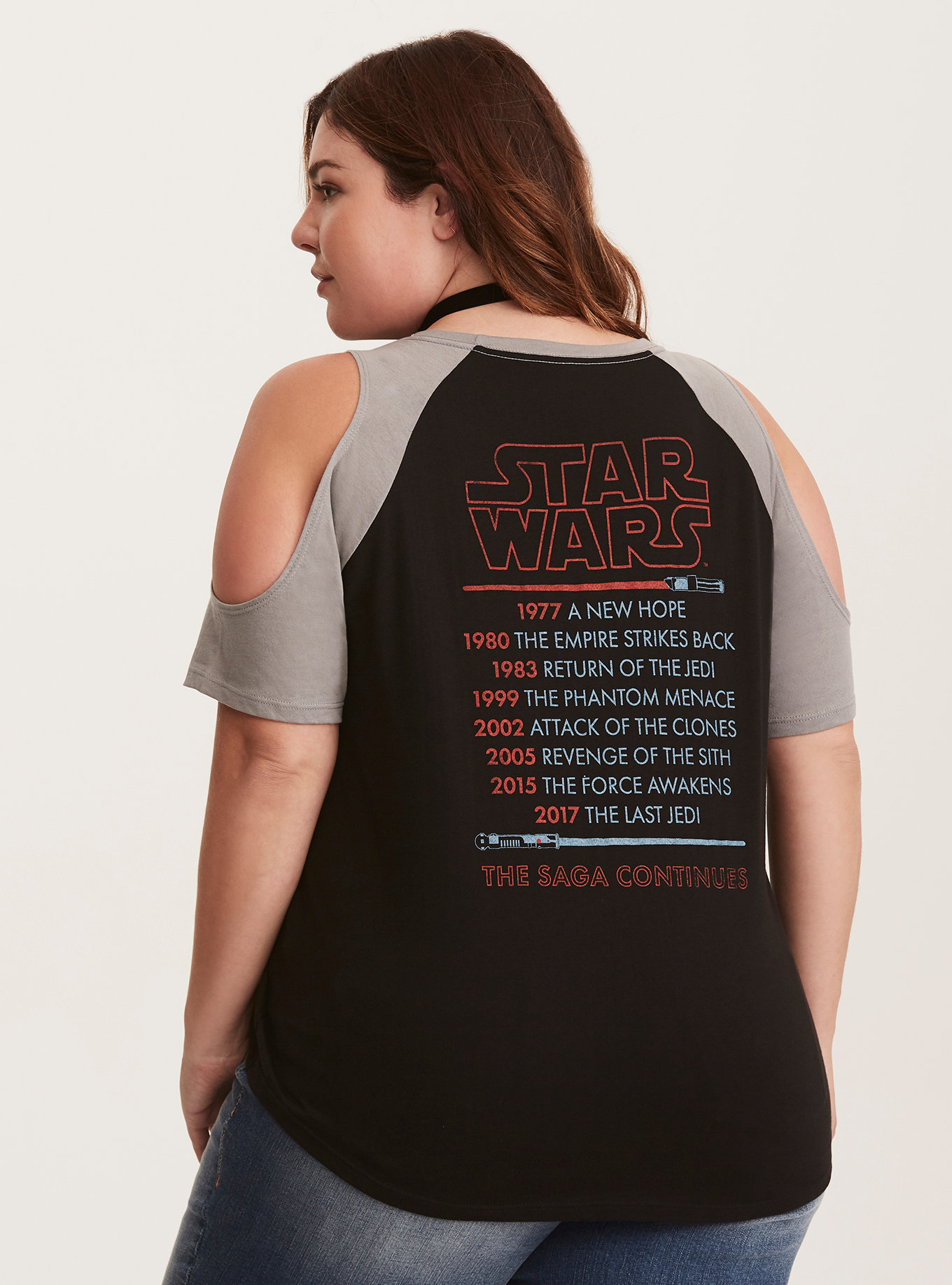 Women’s Star Wars Last Jedi cold shoulder raglan tee – US$42.90 each – plus sizes 00 to 6