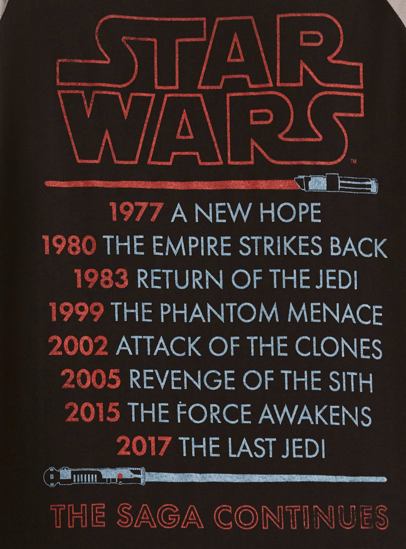 OMG. We don’t think we can wait till December! This black knit tee features a poster graphic for “The Last Jedi” with Rey looking like a total freakin’ badass. The back of the tee has a concert-inspired lineup of all the Star Wars films. Cold shoulder cutouts on the raglan sleeves are worth obsessing over.