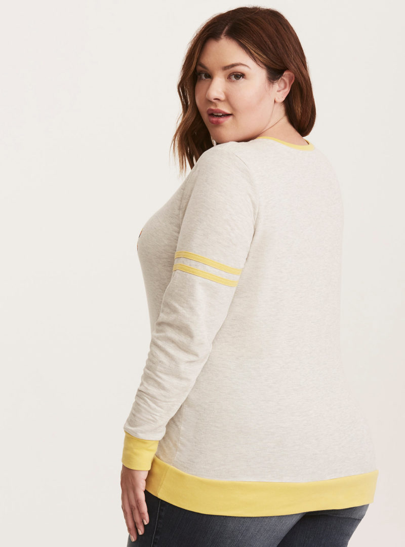 This sweatshirt looks like it came out at the same time as A New Hope, i.e. the “Star Wars” logo is totally vintage-inspired, like you walked right out of 1977. Oatmeal French Terry knit keeps it loose and lightweight, with a ribbed hem and a crew neck. Groovy yellow trim highlights the striped sleeves, hem and collar.
