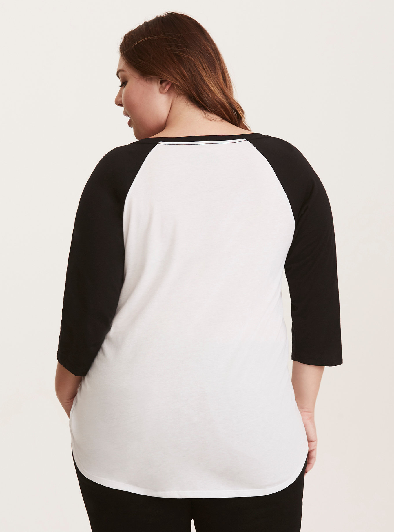 You don’t need sage wisdom from Yoda when it comes to this tee; just snap it up already. The white knit style gets some sporty appeal with black raglan sleeves. The “May the Force be with you” graphic is slightly distressed, like you made it to the Death Star and back.