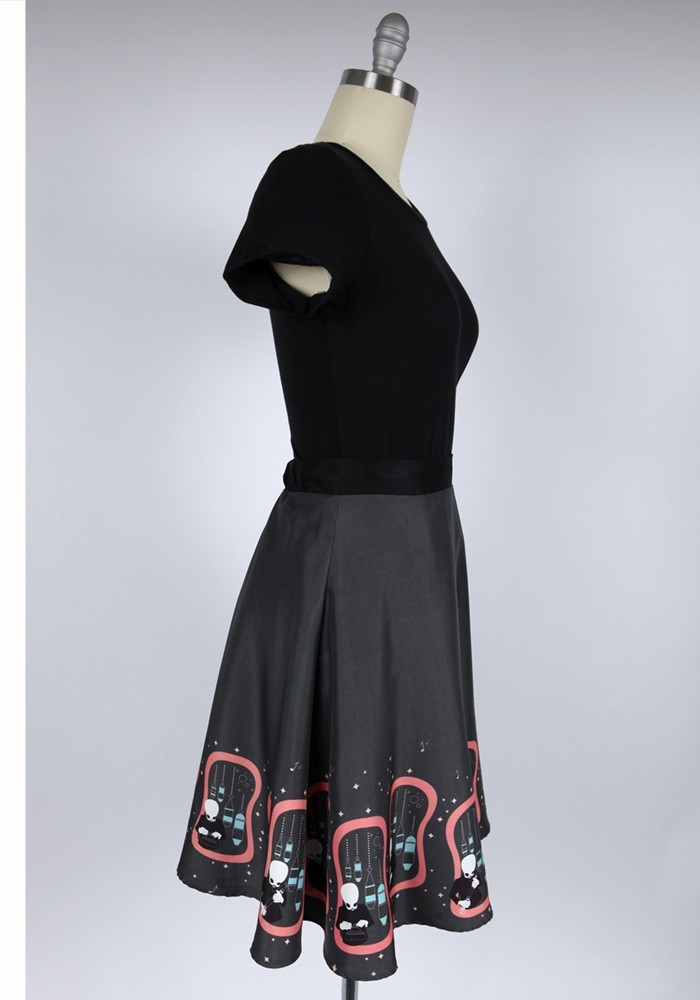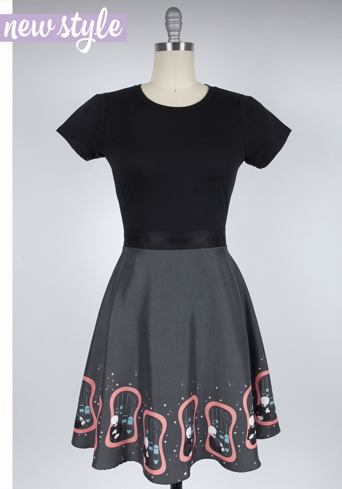 This new Cantina Band skirt has a retro feel as it features a starry field and the smooth swinging sounds of Figrin D’an and the Modal Nodes. Match it with our Cantina Band Tee and you have the perfect ensemble for a night out at the Mos Eisley Spaceport!