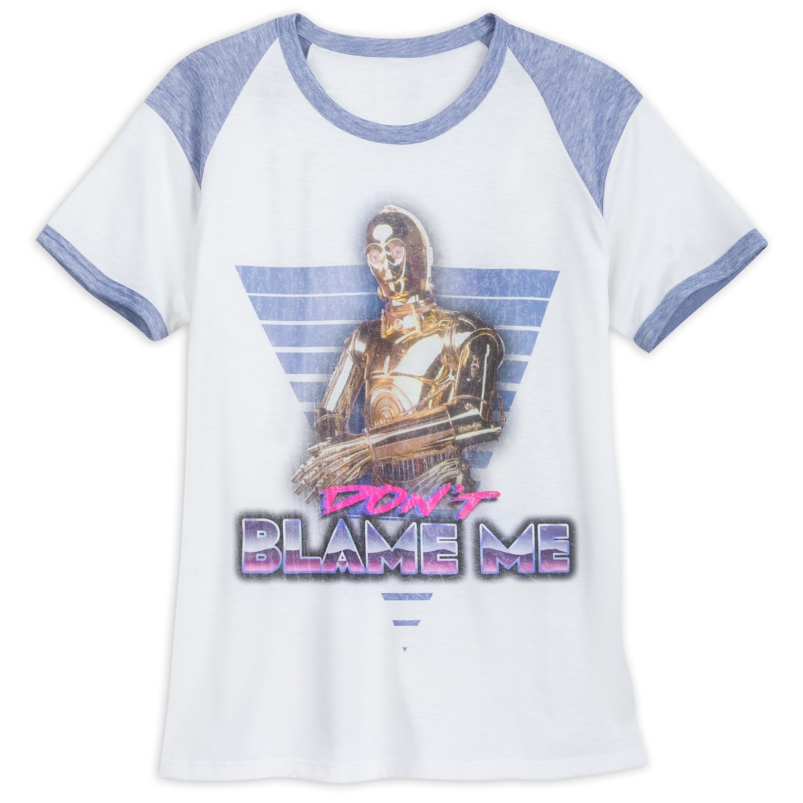 This women’s Star Wars C-3PO t-shirt is now available at Shop Disney. The white t-shirt features contrast panels at the shoulders, contrast binding at the neckline and sleeve hems, and a front print of C-3PO with the text ‘Don’t Blame Me’.