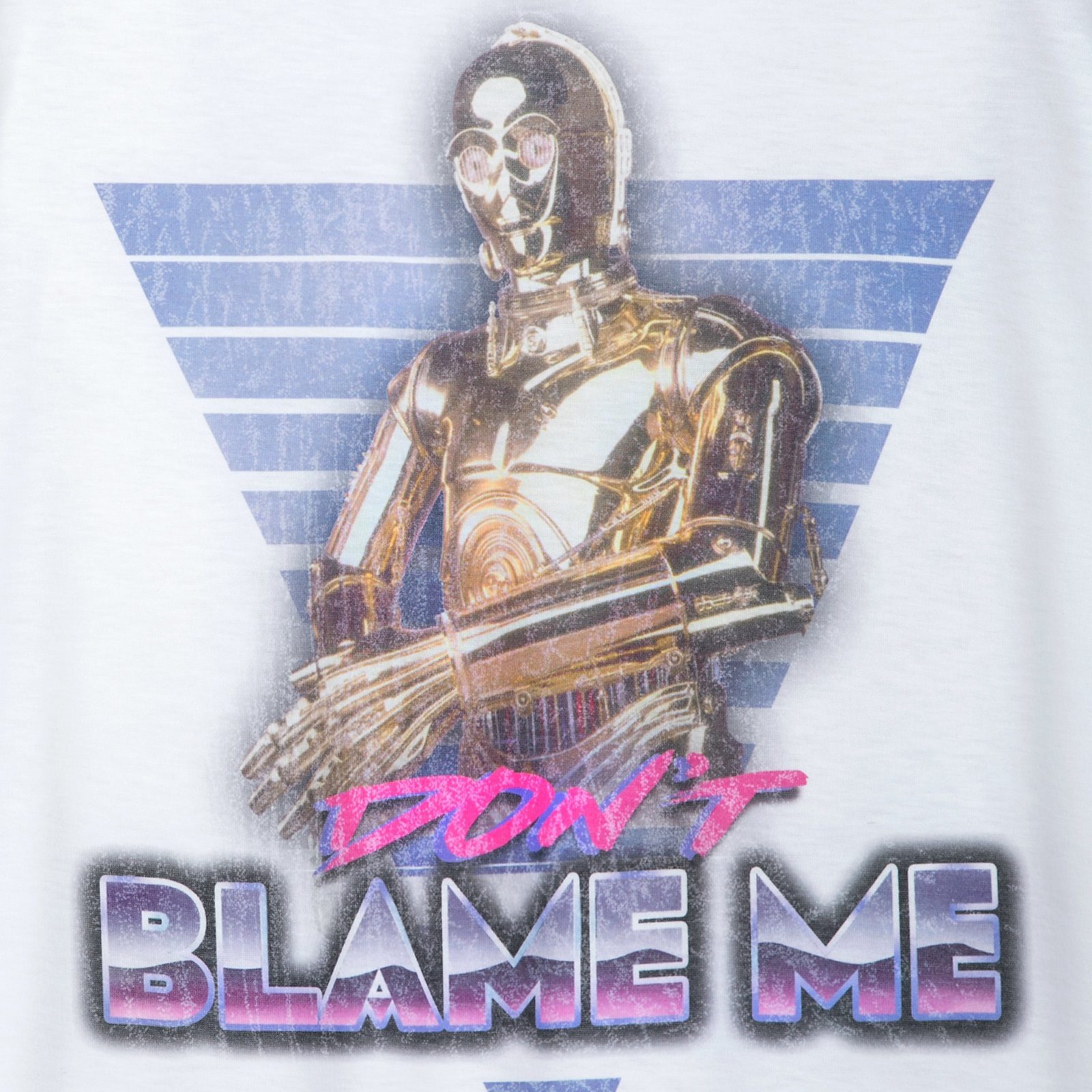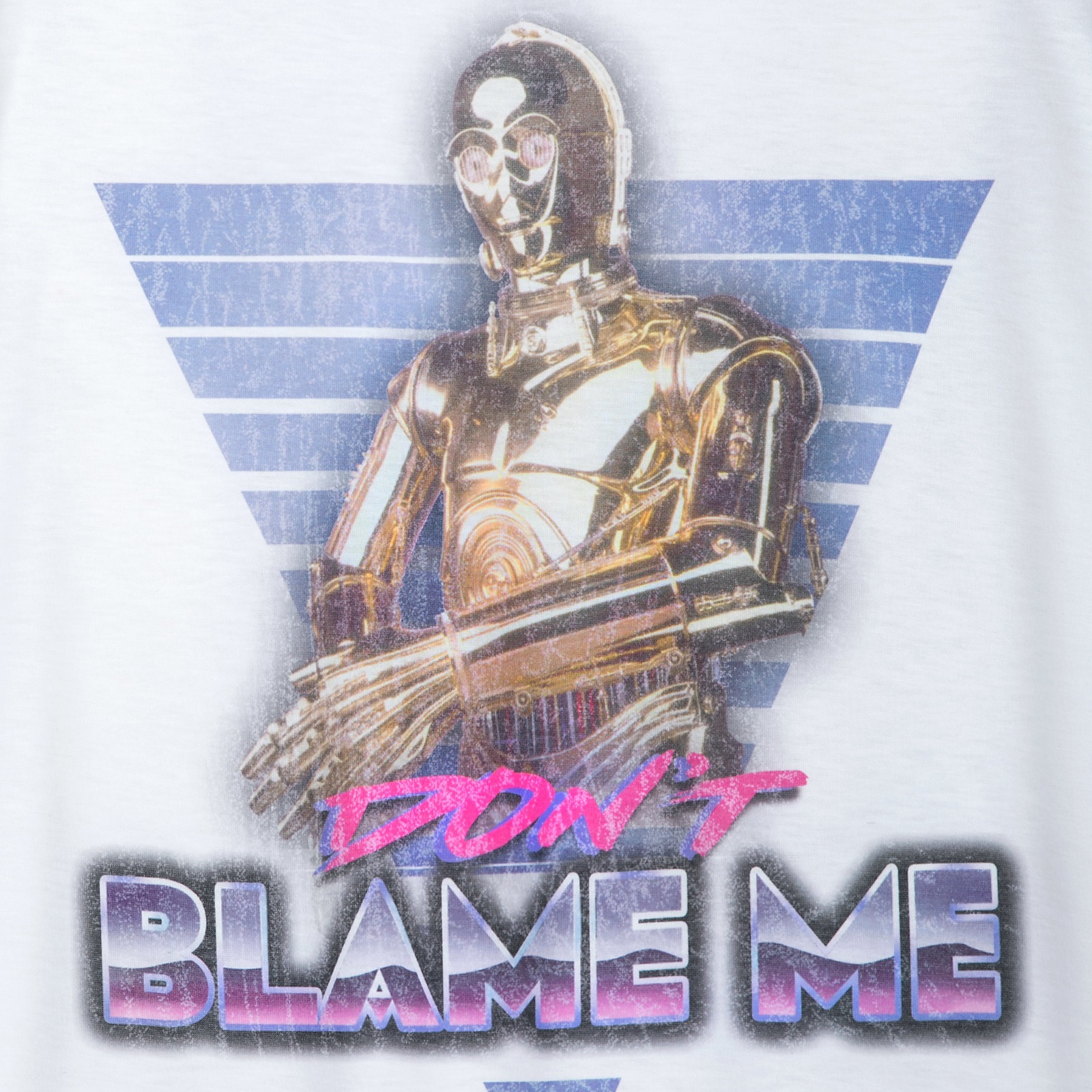 The golden protocol droid isn’t accepting responsibility as C-3PO implores, ”Don’t Blame Me” on this Star Wars T-shirt for women. Featuring ringer styling and soft blended fabric, its short raglan sleeves include a heathered panel.