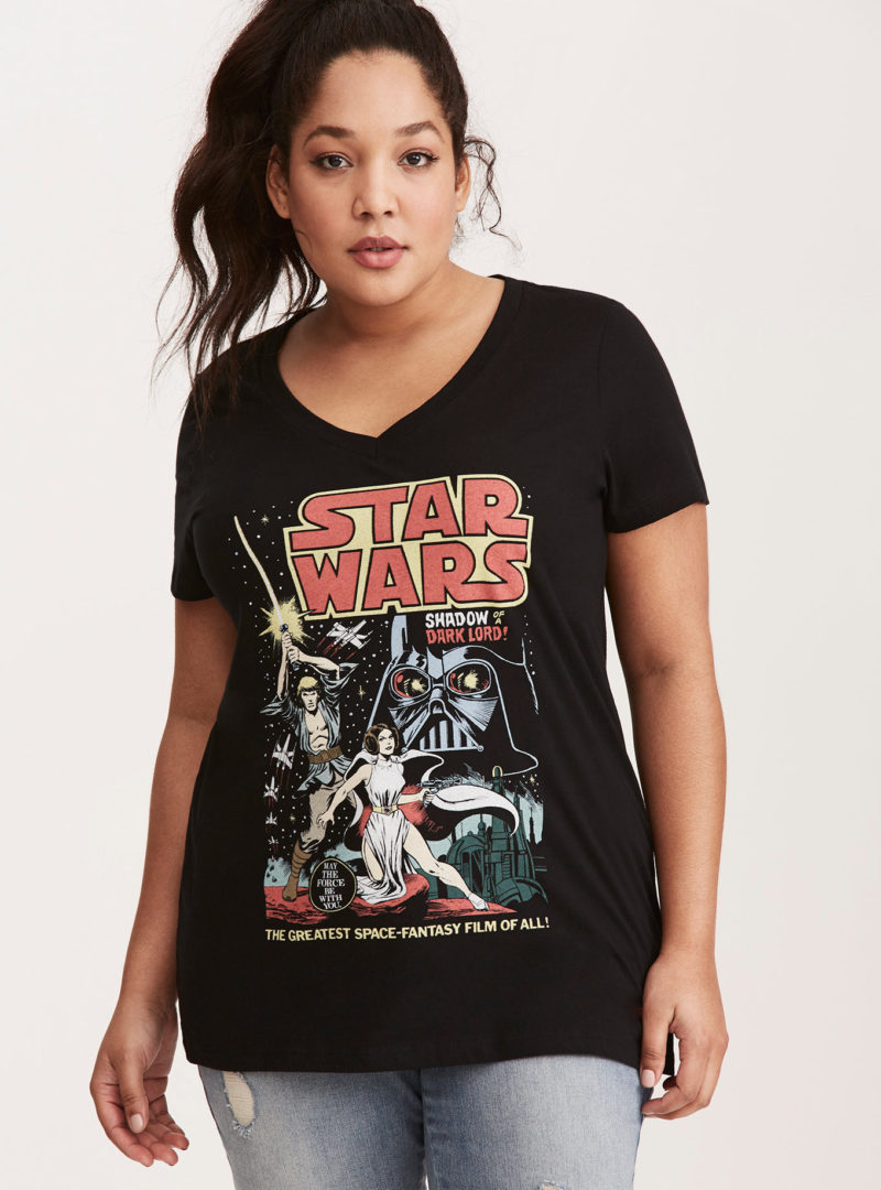 Torrid has a new women’s Star Wars plus size tee available. The black v-neck t-shirt features a front print of vintage Star Wars comic artwork. The artwork is by Rick Hoberg and Dave Cockrum, from the cover of The Marvel Comics Illustrated Version of Star Wars, which was first printed in 1977.