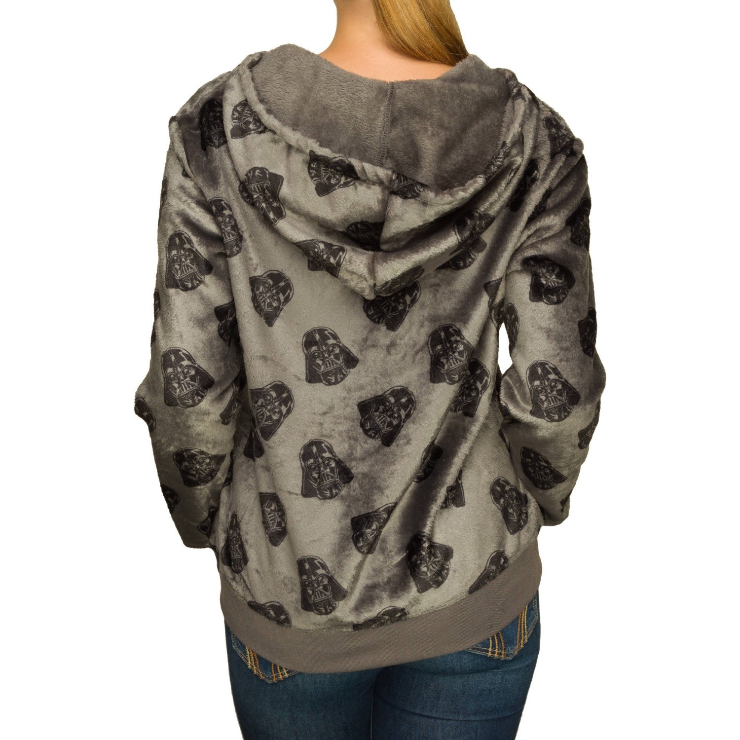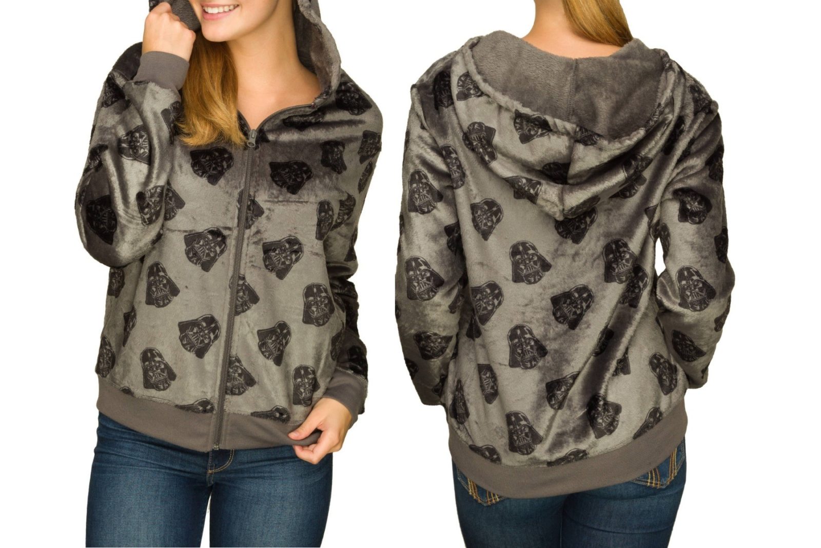 This new women’s Darth Vader plush hoodie is available at Walmart. The grey zip-up hoodie is made from a plush fluffy fabric, with a repeating all-over print of Darth Vader’s helmet. It looks so warm and snuggly – perfect for colder weather.