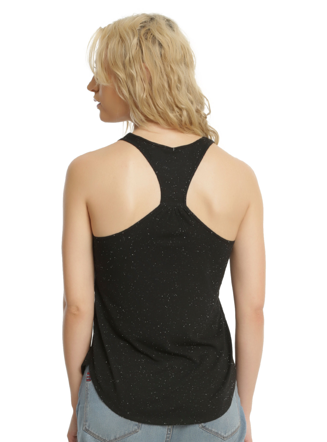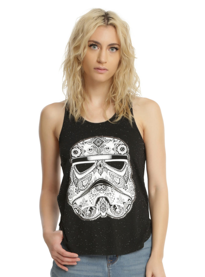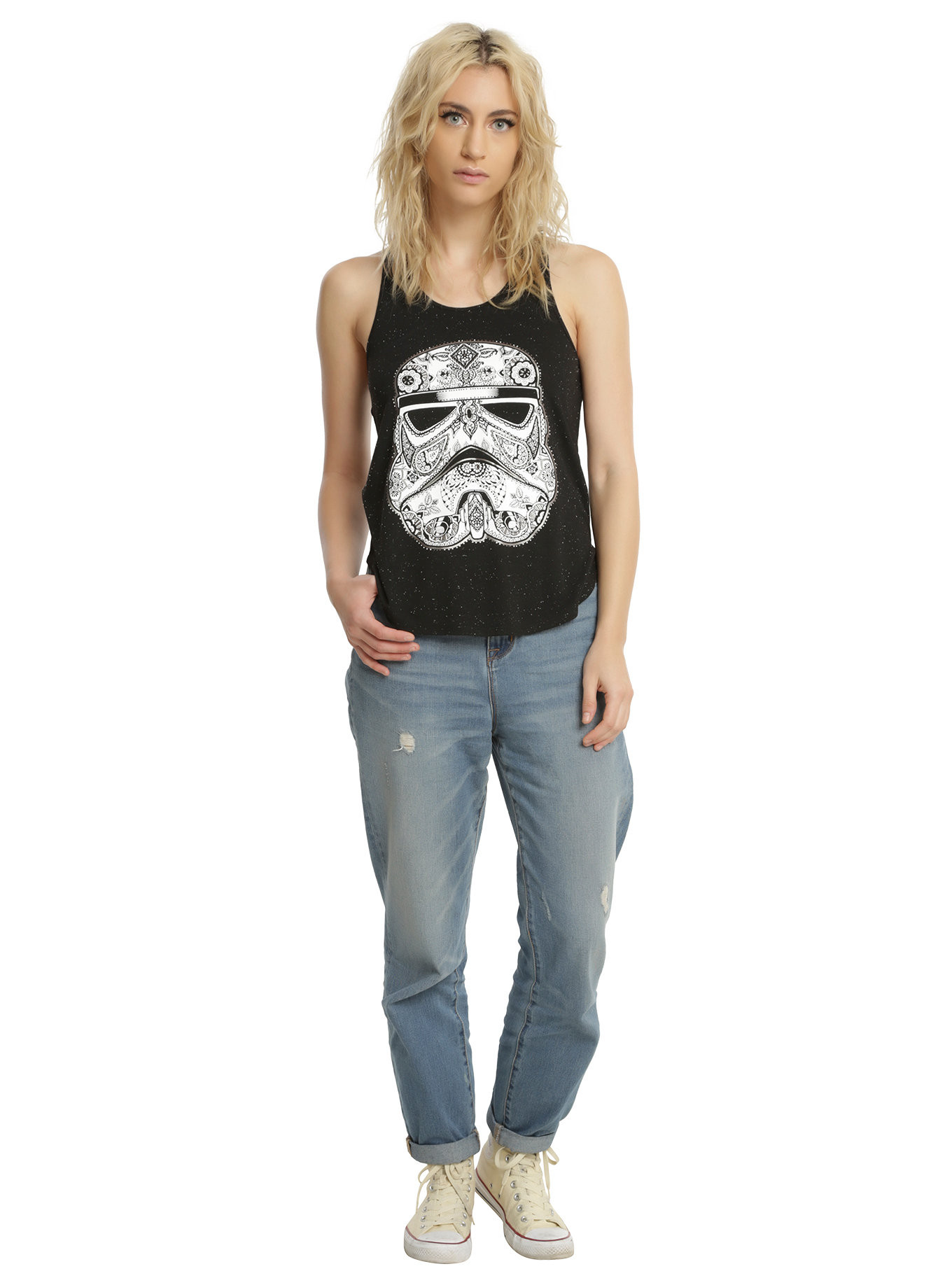 Show off the softer side of stormtroopers with this tank top from Star Wars. The black speckled racer back features an image of a silver foil accented paisley stormtrooper helmet on front.
