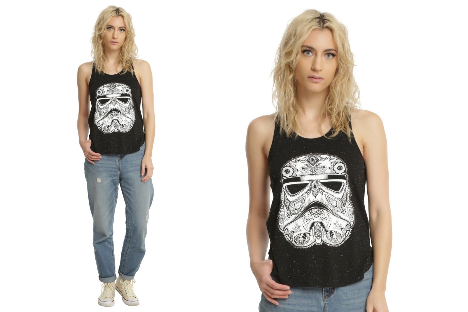 This new women’s Paisley Stormtrooper tank top is available at Hot Topic. The black racerback tank top has an all-over speckle, and a front print of a black and white Paisley Stormtrooper helmet, accented with silver foil. The speckle fabric gives the effect of a starry sky background, which coordinates well with the Star Wars theme.