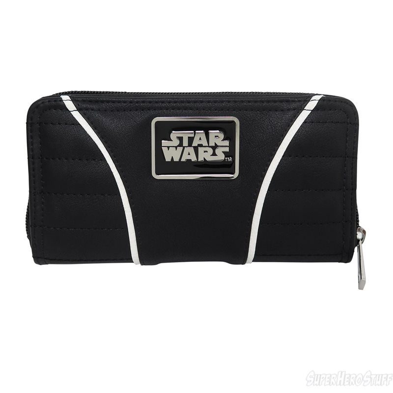 This rectangular Star Wars wallet for women features a sizable Imperial symbol colored in white and measuring 2.25″ across in diameter. It rests on a stitched, black swatch trimmed in white reflecting official Imperial-wear. The back features a raised metallic emblem sporting the Star Wars logo.