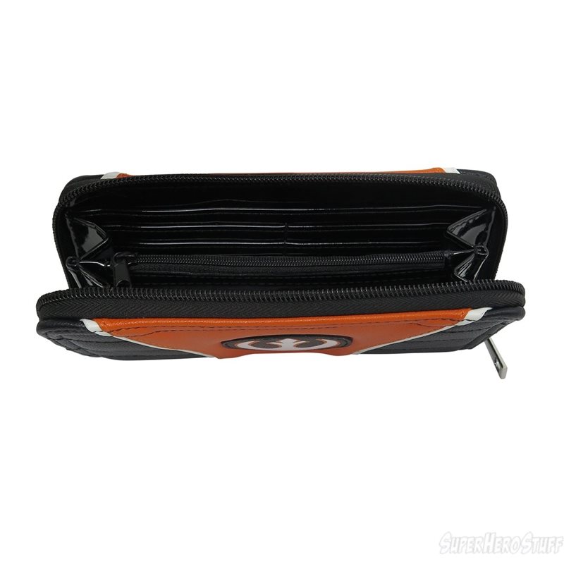 This rectangular Star Wars wallet for women features a sizable Rebel Symbol layering a black backing measuring 2.25″ across in diameter. The circular symbol rests on a stitched orange swatch trimmed in white; it reflects official Rebel-branded space-wear. The back features a raised metallic emblem sporting the Star Wars logo.