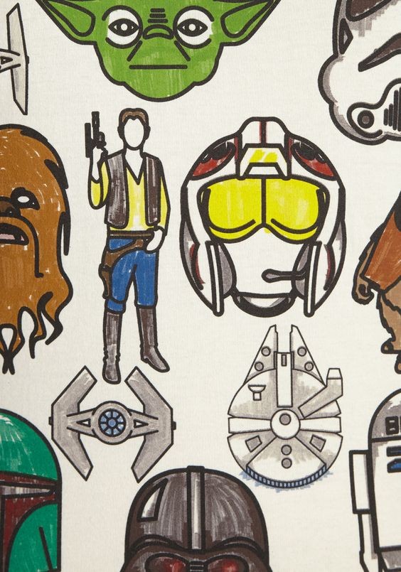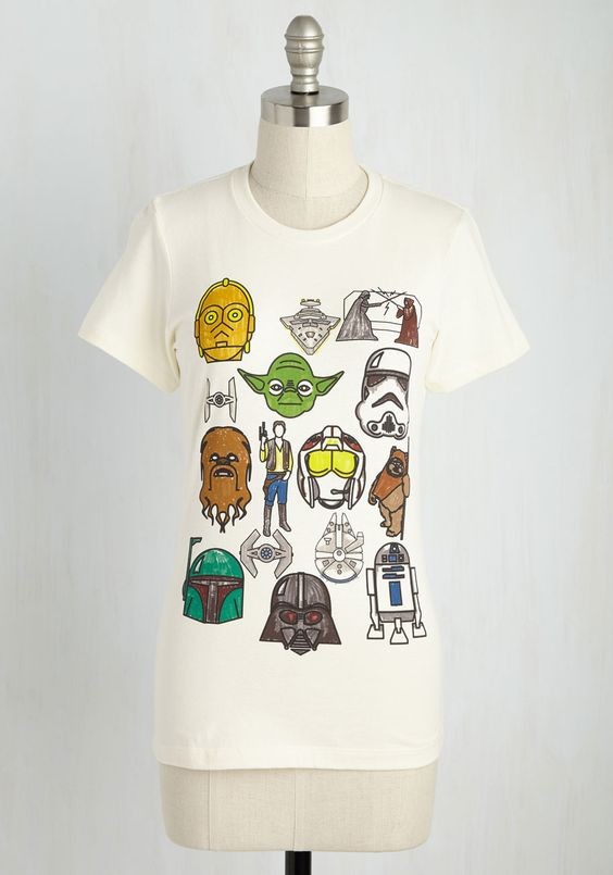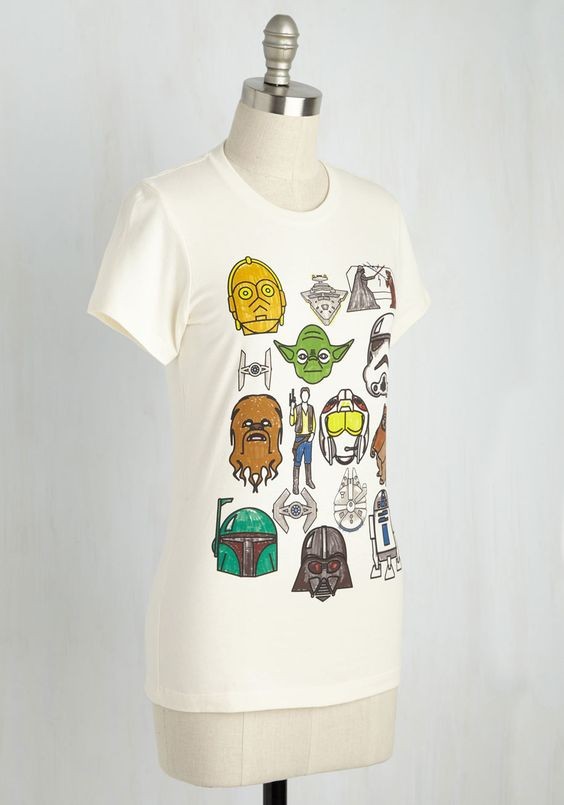 What have we here? This ivory T-shirt touts marker-inspired illustrations of all your favorite Star Wars characters and motifs! Wearing this top, you’ll be the most savvy geek-chic gal in the galaxy.