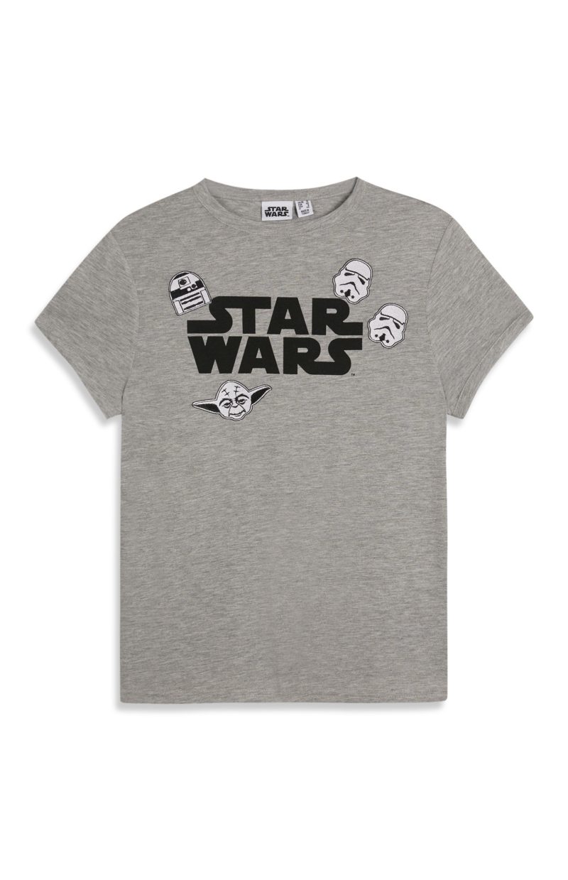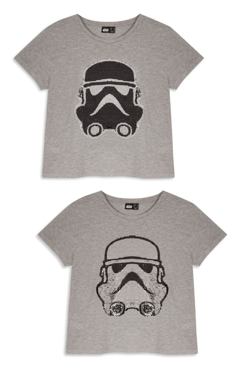 UK based store Primark has two new women’s Star Wars t-shirts available. The first is a women’s grey t-shirt with a Stormtrooper helmet design created with sequins! While the photo seems to show 2 versions, this is actually the same t-shirt – brushing the sequins up or down shows a different colour side, so it can appear black or silver! The second t-shirt features a front print of the Star Wars logo, with small character heads (R2-D2, Yoda, and Stormtroopers).