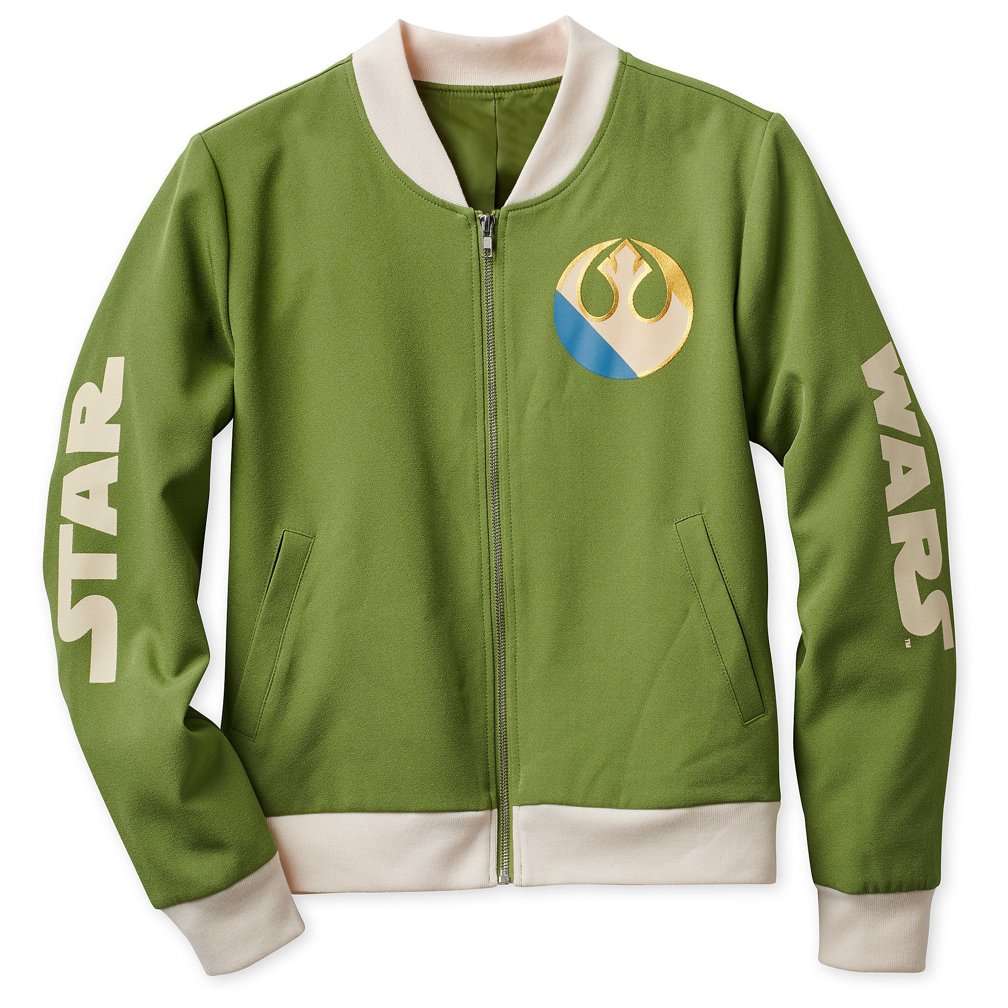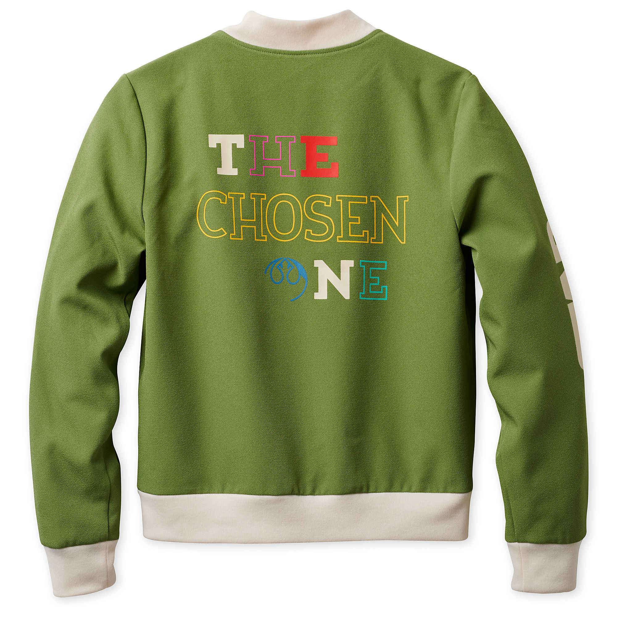 This women’s Star Wars track jacket is now available at Shop Disney. The green zip-up jacket features the Star Wars logo printed on the sleeves (‘Star’ on one sleeve’, ‘Wars’ on the other sleeve), the Rebel ‘starbird’ symbol the front upper left chest, and the text ‘The Chosen One’ printed across the back. There is contrast ribbed accents at the neckline, sleeve hems, and lower hem, while the interior is lined in a silky-feel green polyester fabric.