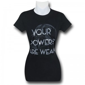SuperHeroStuff has added two more women’s Star Wars items to their website. Following on from the R2-D2 yoga pants recently released, comes these TIE Fighter yoga pants. The black pants feature a contrasting grey folded waist band, with a large Star Wars logo down the right leg, with a TIE Fighter print on the upper left leg. Available in sizes S to XXL, the pants priced at US$42.99 each (with XXL priced slightly higher at US$44.99). The second newly added item is a women’s black t-shirt, featuring Darth Vader and the text ‘Your powers are weak’. Available in sizes S to XXL, the t-shirt is priced at US$23.99 (with XXL priced slightly higher at US$25.99). SuperHeroStuff can ship internationally, which is great.
