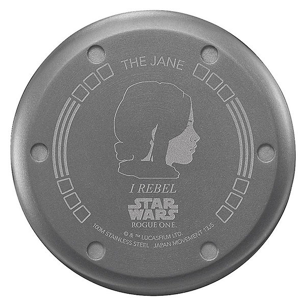 The new Nixon x Star Wars Jyn Erso watch is now available at ThinkGeek. The women’s watch uses the Nixon ‘Jane Leather’ design, inspired by Jyn Erso’s costume from Rogue One. The details include a leather wriststrap with Death Star plans printed on the back, the Rebel Alliance symbol at the 12 o’clock marker, seconds hand features the U-Wing, and the back of the watch is engraved with Jyn Erso and the text ‘I Rebel’.