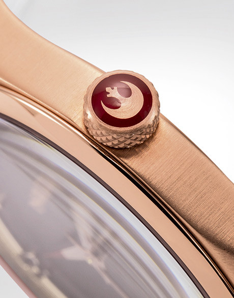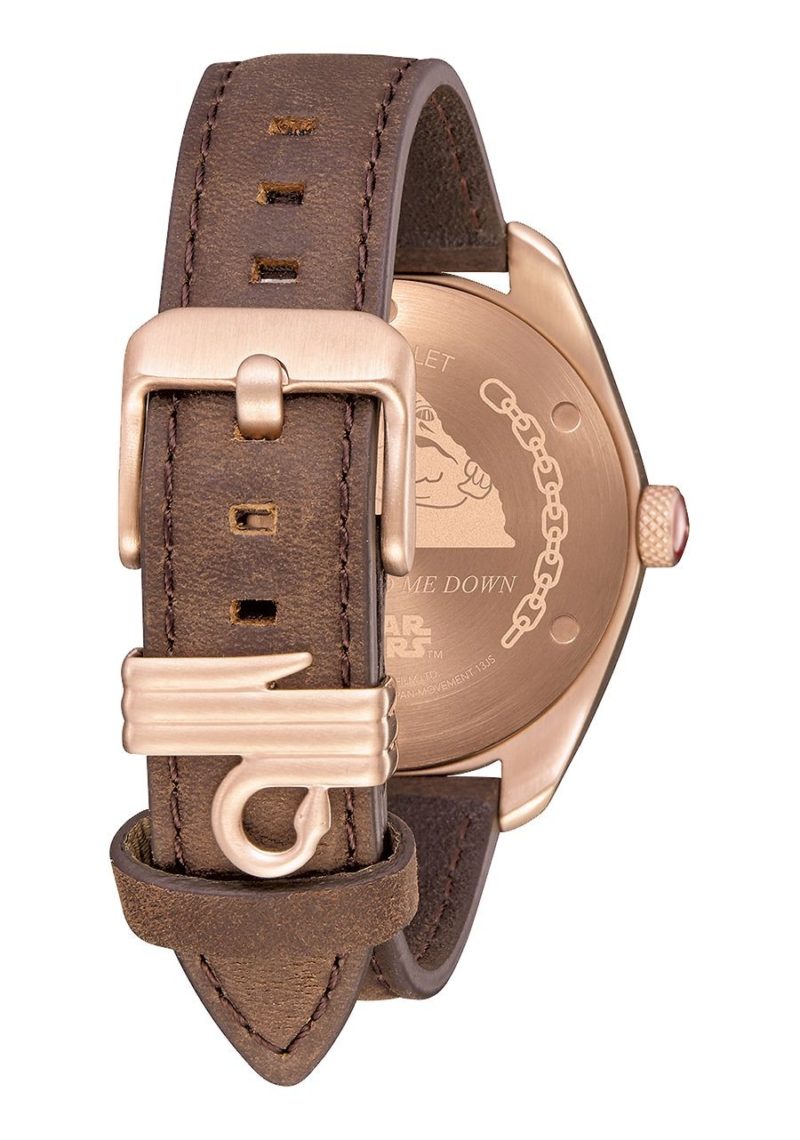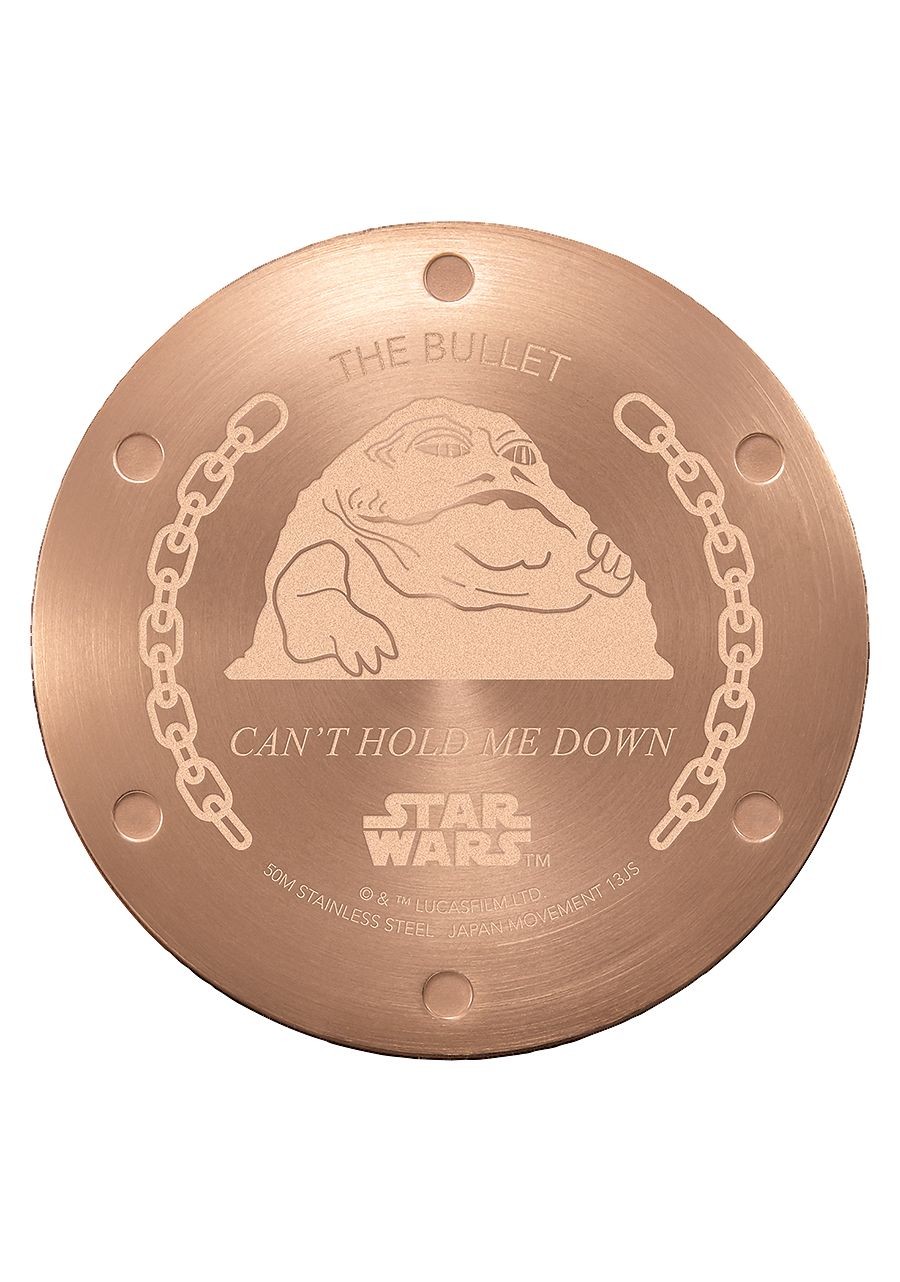 I especially love the custom strap keeper, designed after the arm band Princess Leia wears at Jabba’s palace. The side pusher features the Rebel Alliance symbol, and the watch hands have burgundy tips, referencing the colours of the metal bikini skirt. For those familiar with the costume, you will recognise the subtle detail of the dots against the rings of the outer watch face. The back of the watch features Jabba the Hutt with chains, and the text ‘Can’t Hold Me Down’.
