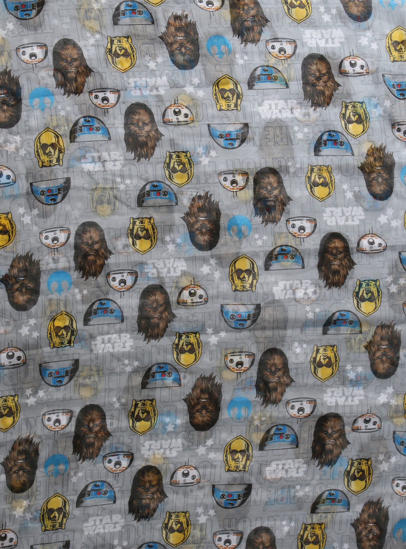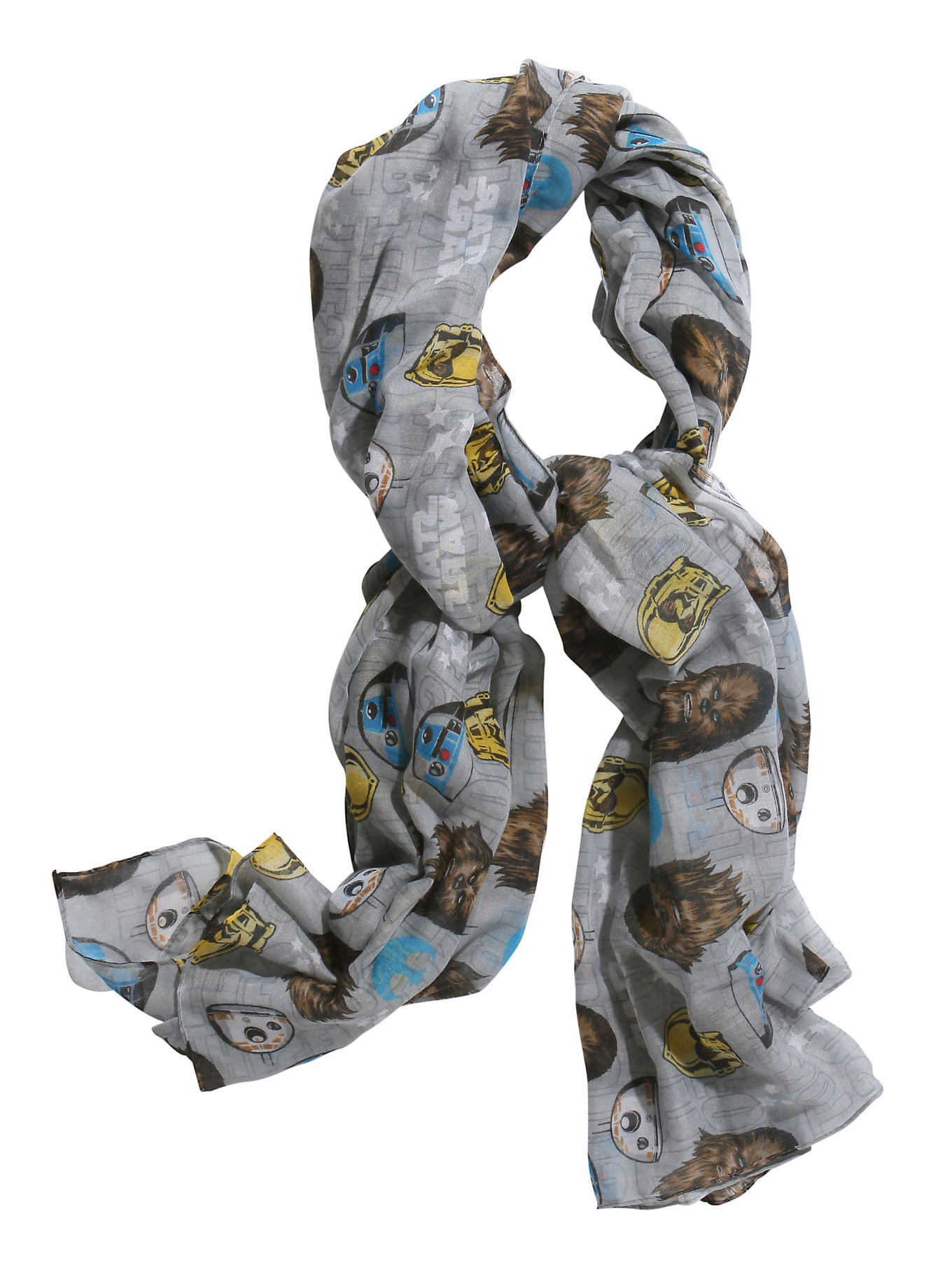 Hot Topic has a new women’s Star Wars fashion scarf available. The lightweight grey scarf features a repeating print of R2-D2, C-3PO, BB-8, Chewbacca, Rebel Alliance symbol, and the Star Wars logo. Behind the main print, the classic quote “Not The Droids You’re Looking For” can be seen – I love this subtle detail!