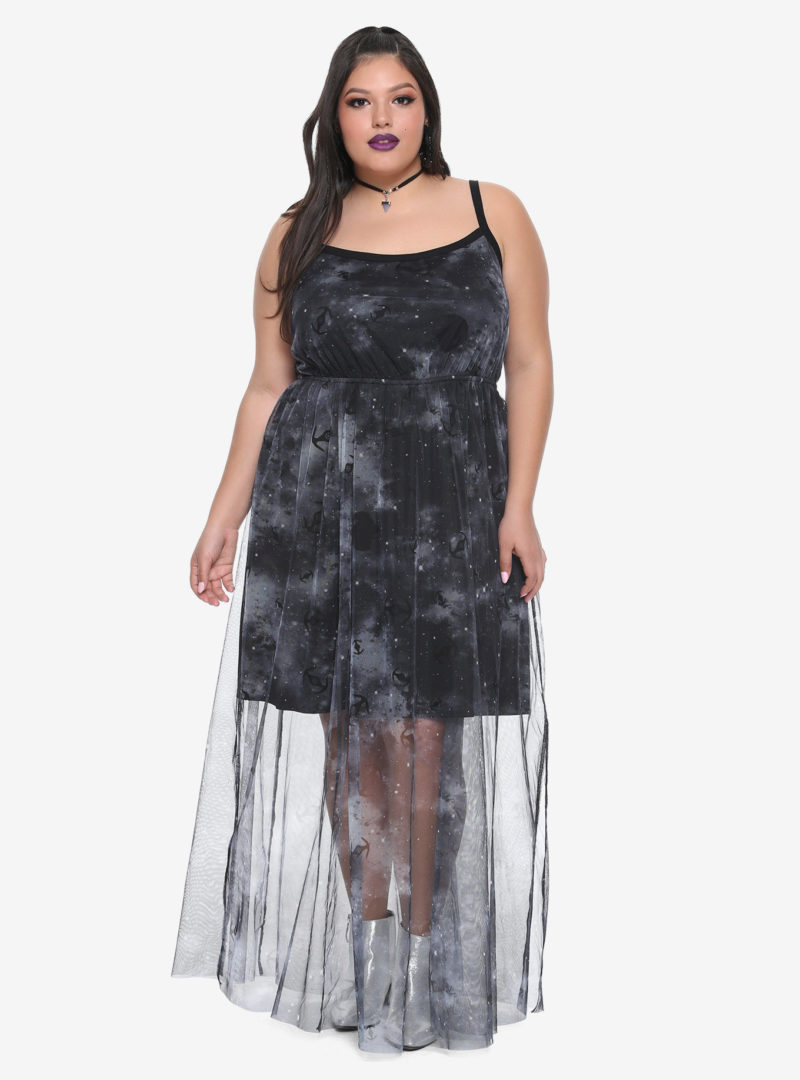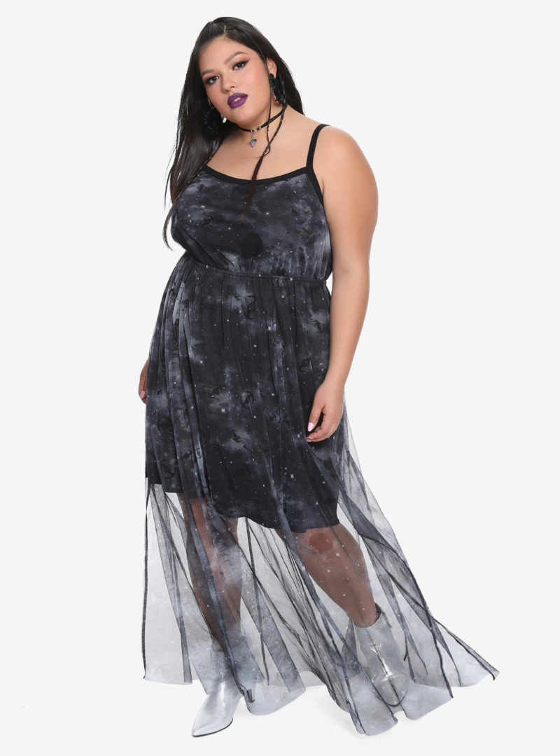This new women’s plus size Star Wars Starfighter maxi dress is now available at Hot Topic. The maxi dress features a short black dress with thin shoulder straps, with a long maxi-style mesh overlay. The mesh fabric features an all-over print of a grey coloured galaxy sky with black silhouettes of TIE Fighters (the dress is also available in standard sizes).