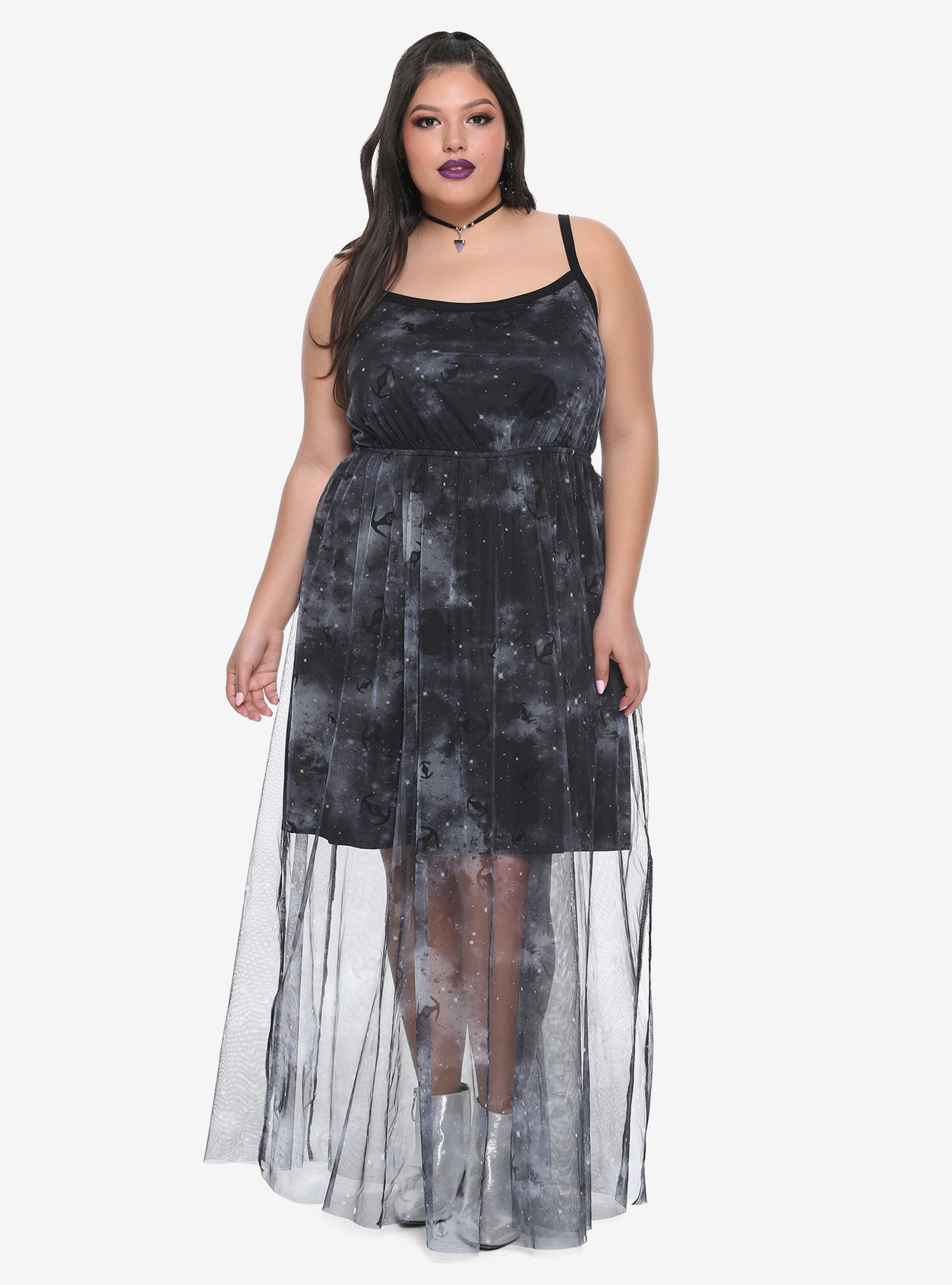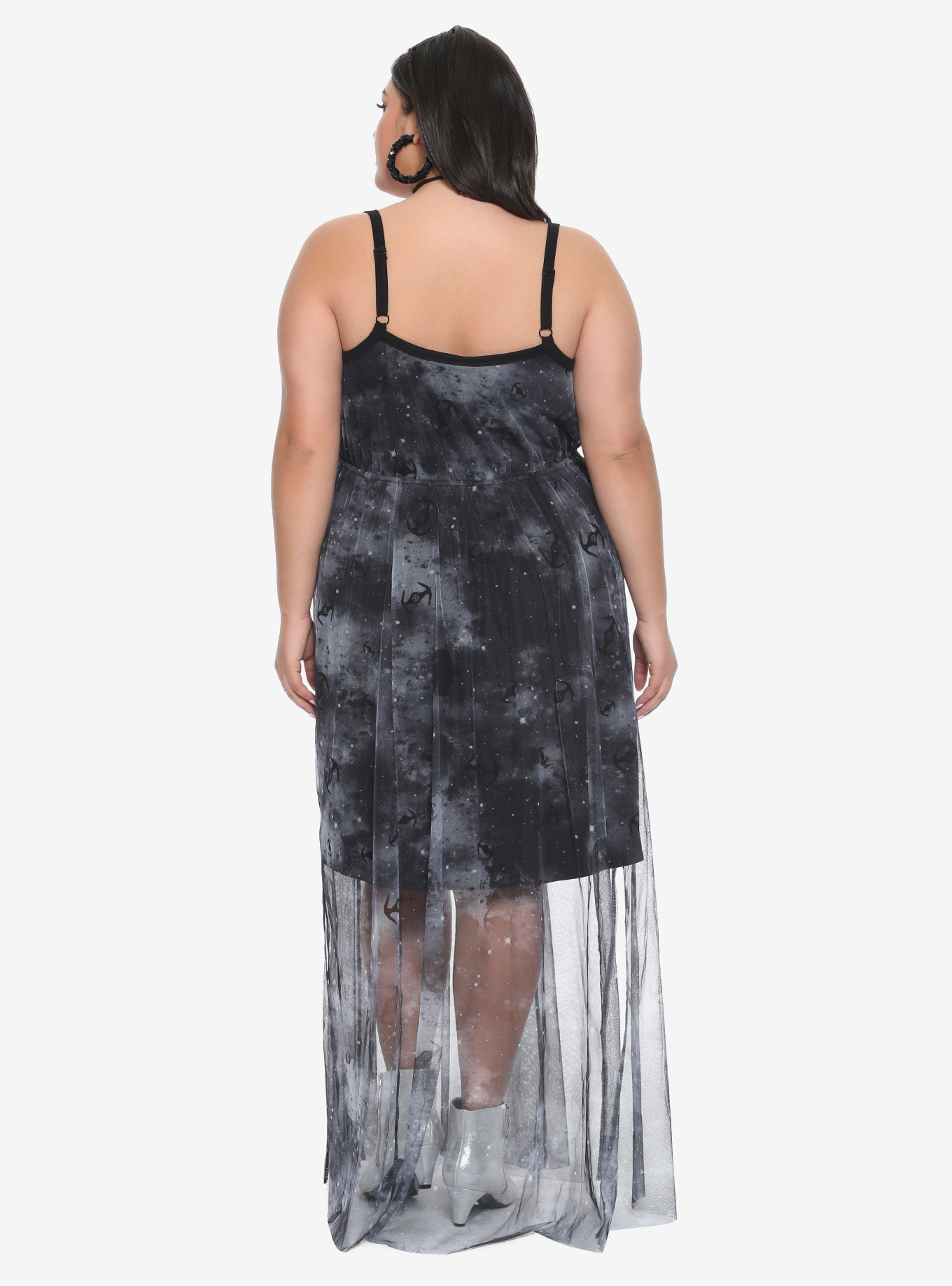 Take your love of Star Wars to the maxi! This dress featuring a starfighter galaxy printed mesh maxi over a solid black shorter slip.