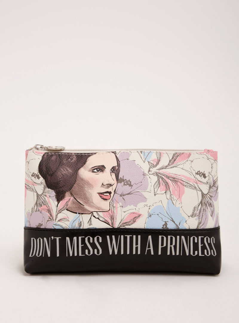 “Don’t mess with a princess.” Especially Princess Leia. This compact makeup bag is your only hope come morning time, with a zip top and a faux leather construction. A floral print is a girly contrast to the fierce Leia graphic.