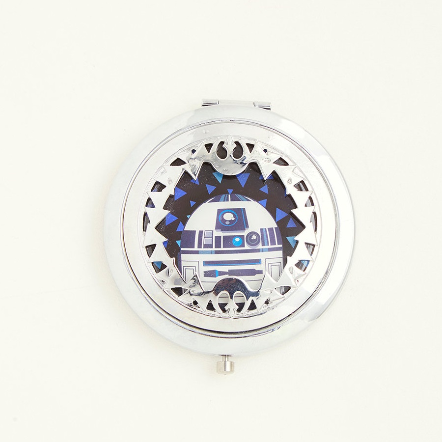 This pretty little R2-D2 pocket mirror is now available at Torrid. The silver-tone metal mirror features R2-D2 on the top lid, with a cut-out borders of triangles and the Rebel Alliance symbol. Inside, there are 2 mirrors, and it closes with a spring closure.
