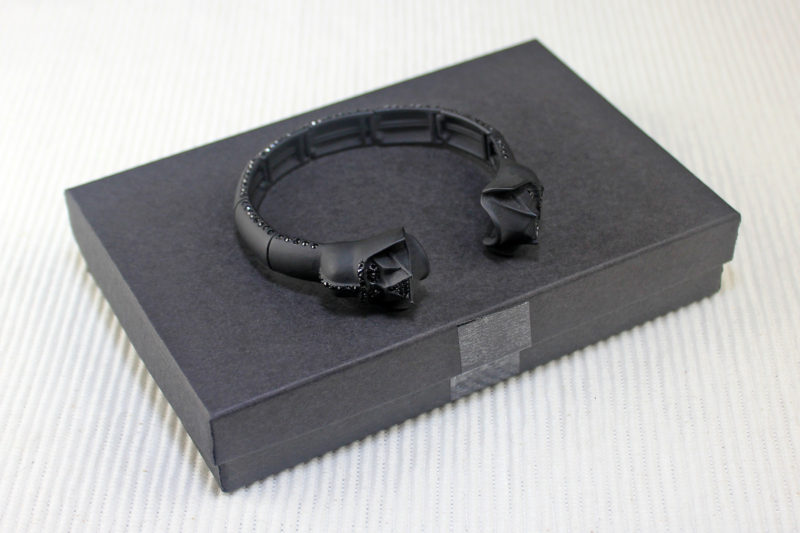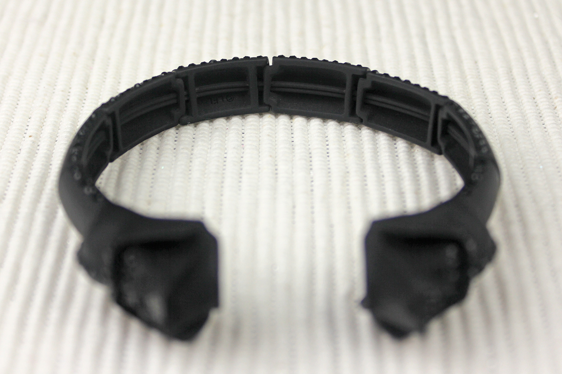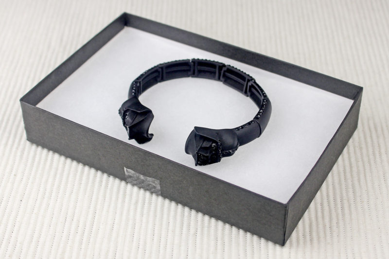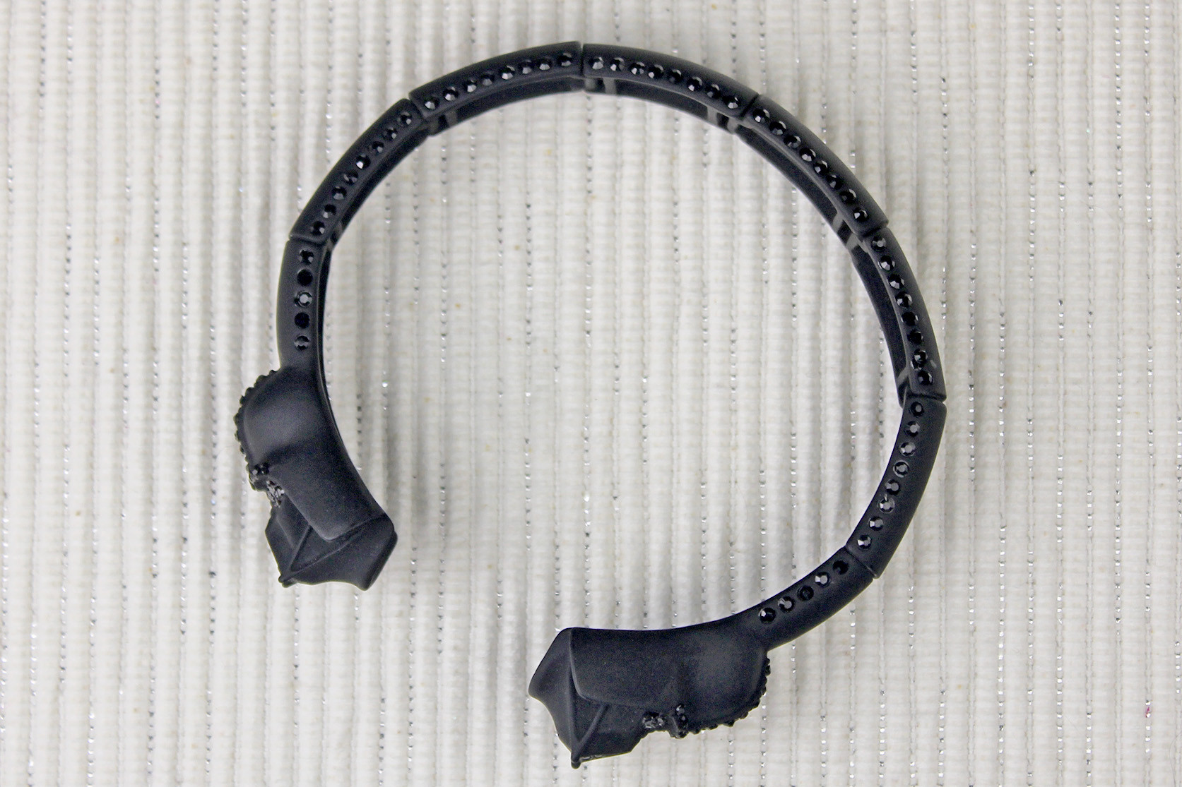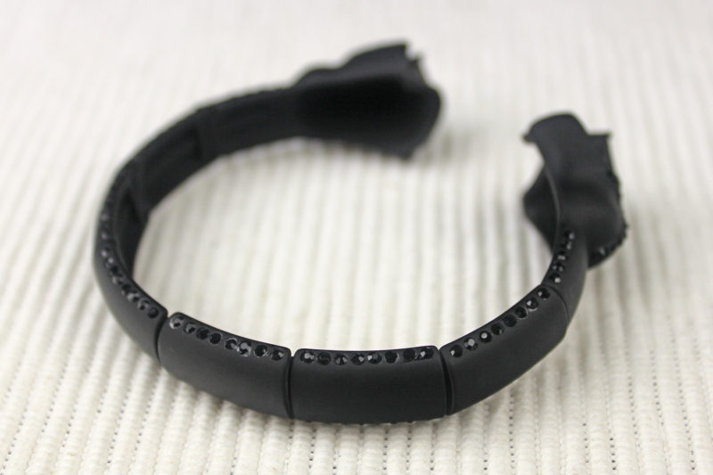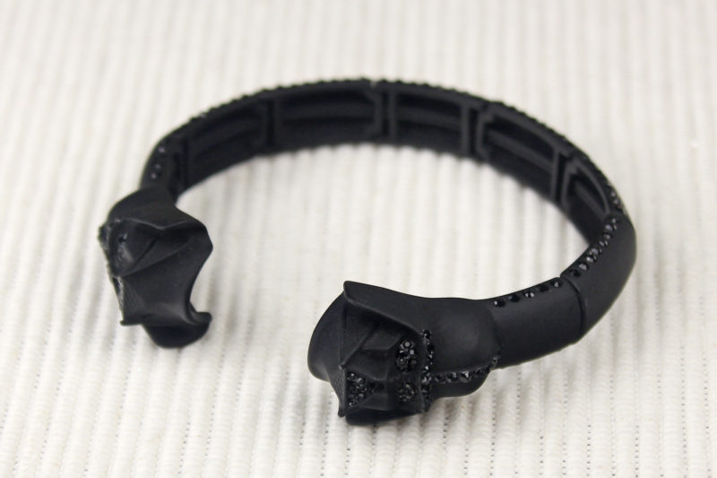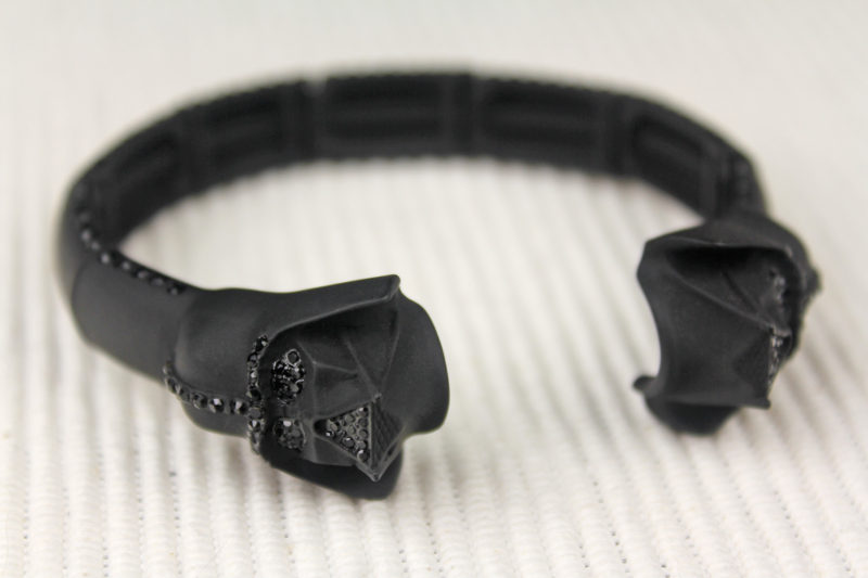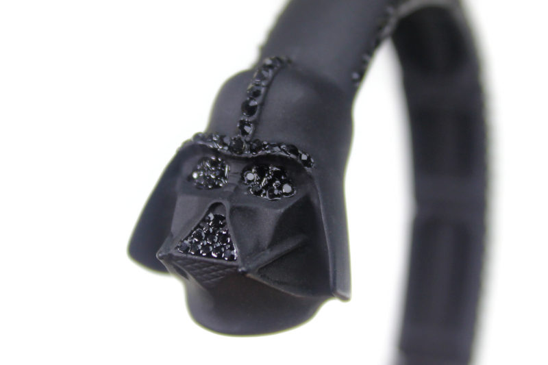 The bracelet is made from 8 curved segments, with the first and last segments ending with a 3D sculpt of Darth Vader’s helmet. All 8 segments are accented with black rhinestones along the edges, and for highlighting details on each helmet sculpture. The bracelet has a soft matte finish, so the rhinestones really stand out nicely.