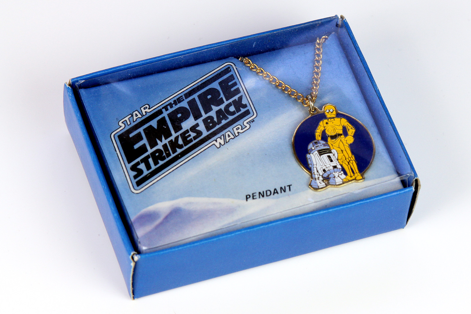 For The Empire Strikes Back the Star Wars jewelry license was held by Wallace Berrie. According to the Collectors Archive, they produced four necklaces – Chewbacca, Darth Vader, R2-D2, and R2-D2 & C-3PO. Interesting that with only four designs, R2-D2 was featured twice. I recently picked up the R2-D2 & C-3PO necklace on ebay for US$17.99. That’s a little higher priced than the rings from the same collection, but the necklaces seem to be a little harder to find.