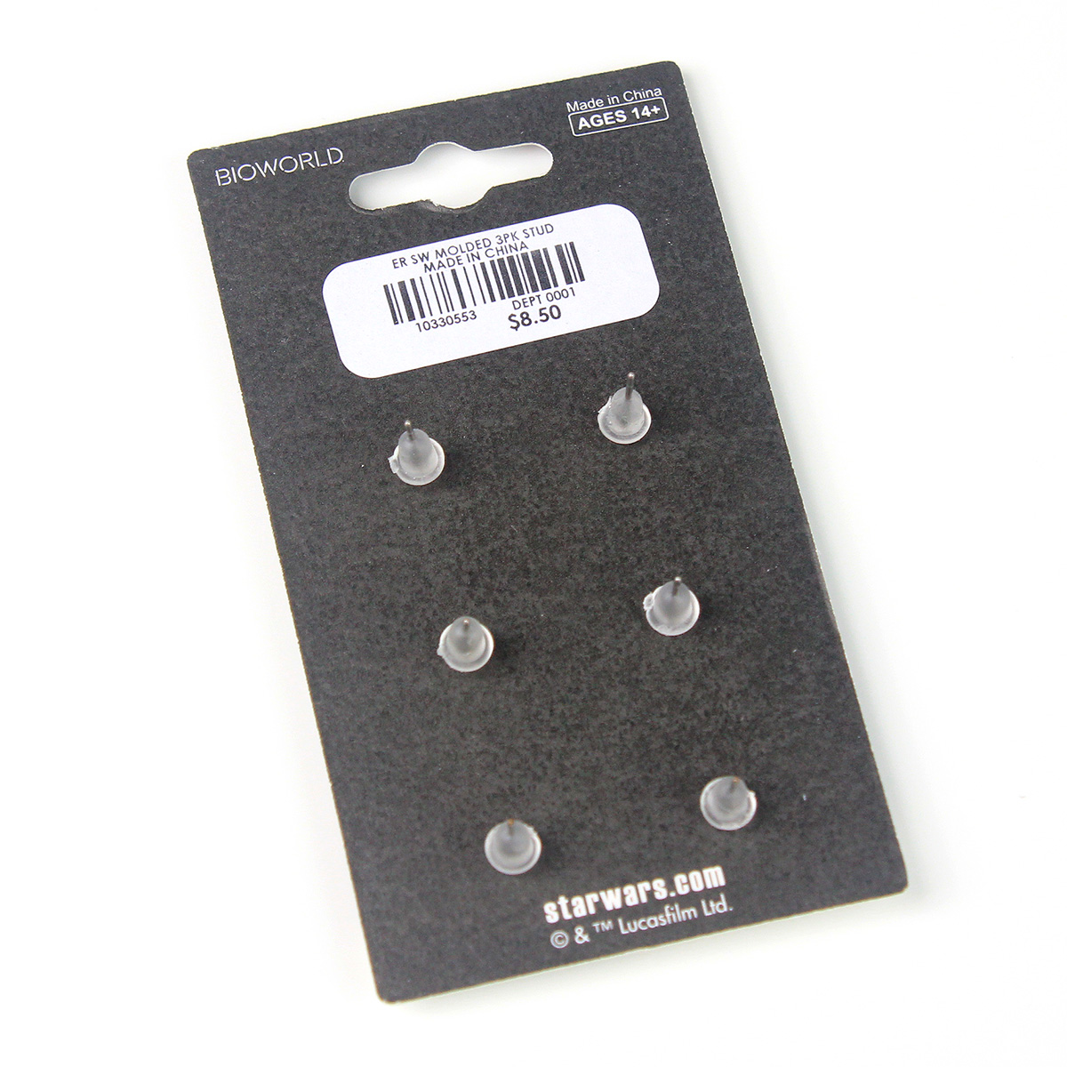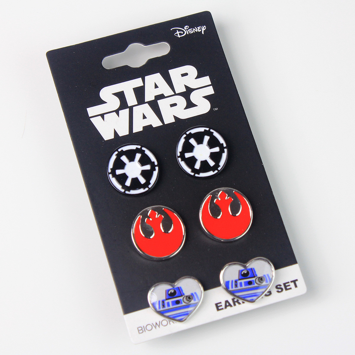 Hot Topic is a great stockist for Bioworld Star Wars accessories, so I’m often picking up the latest necklace or earring sets during their site-wide sales. A recent purchase was the Star Wars ‘Logo Love’ 3-pack of stud earrings, which I bought on sale for US$5.92. This set includes two enamelled logo earrings and ‘Heart R2-D2’ earrings. The Rebel Alliance earrings are silver with red enamel, the Imperial earrings are black with white enamel, while the R2-D2 earrings are silver with the image set under clear resin. These stud earrings are larger than other Star Wars logo earrings (like those made by Body Vibe or Loungefly), each measuring approximately 1.5cm across. The earrings have small plastic/rubber backings, which grip in place nicely. I think it’s a great earring collection, the colours really stand out. The set is still available from Hot Topic (at the time of writing), priced at US$8.50 – but the current promotion gives 25% off with the code ‘SCHOOL’.