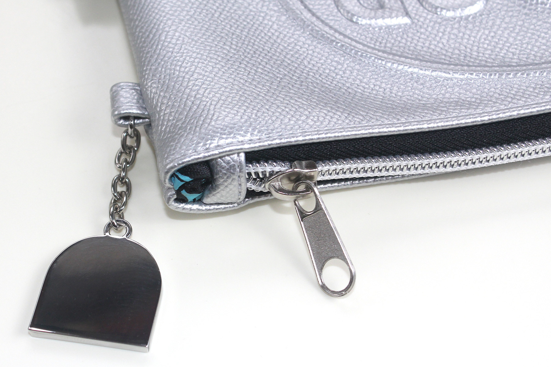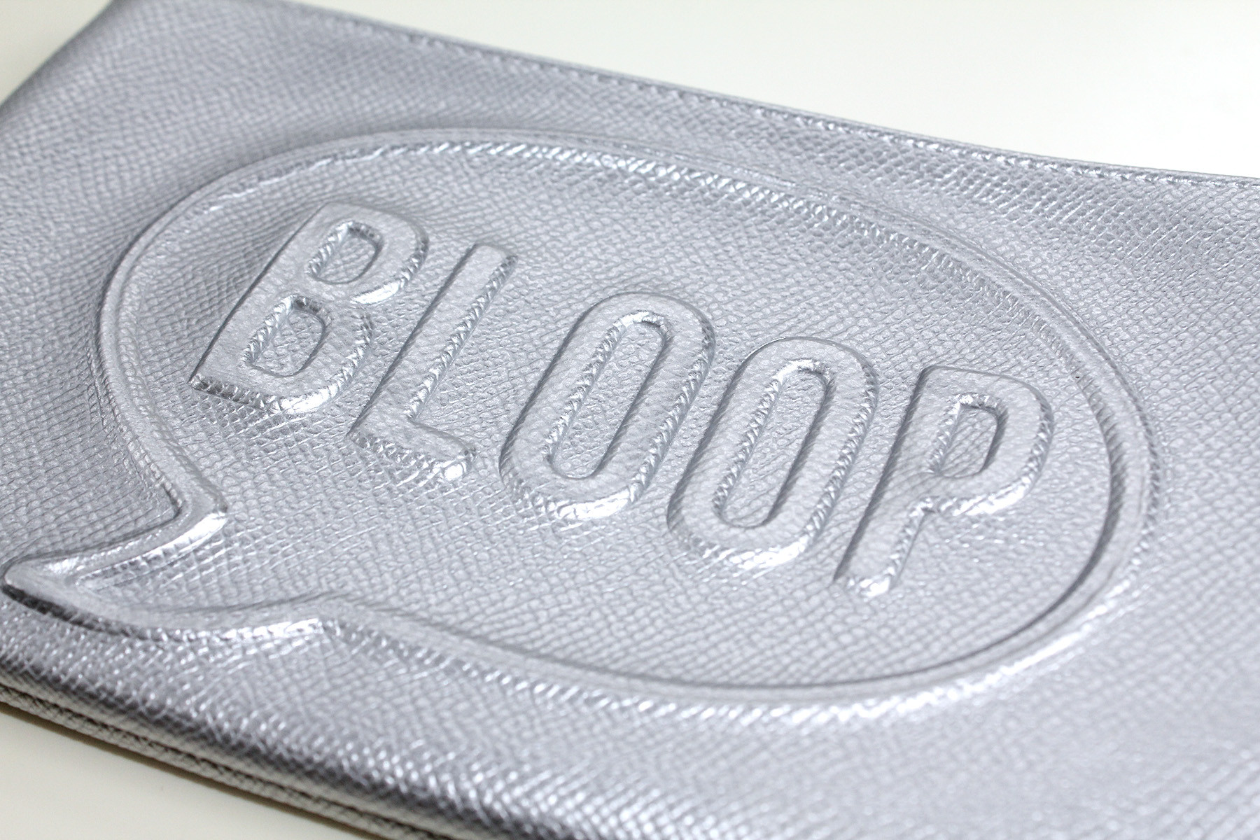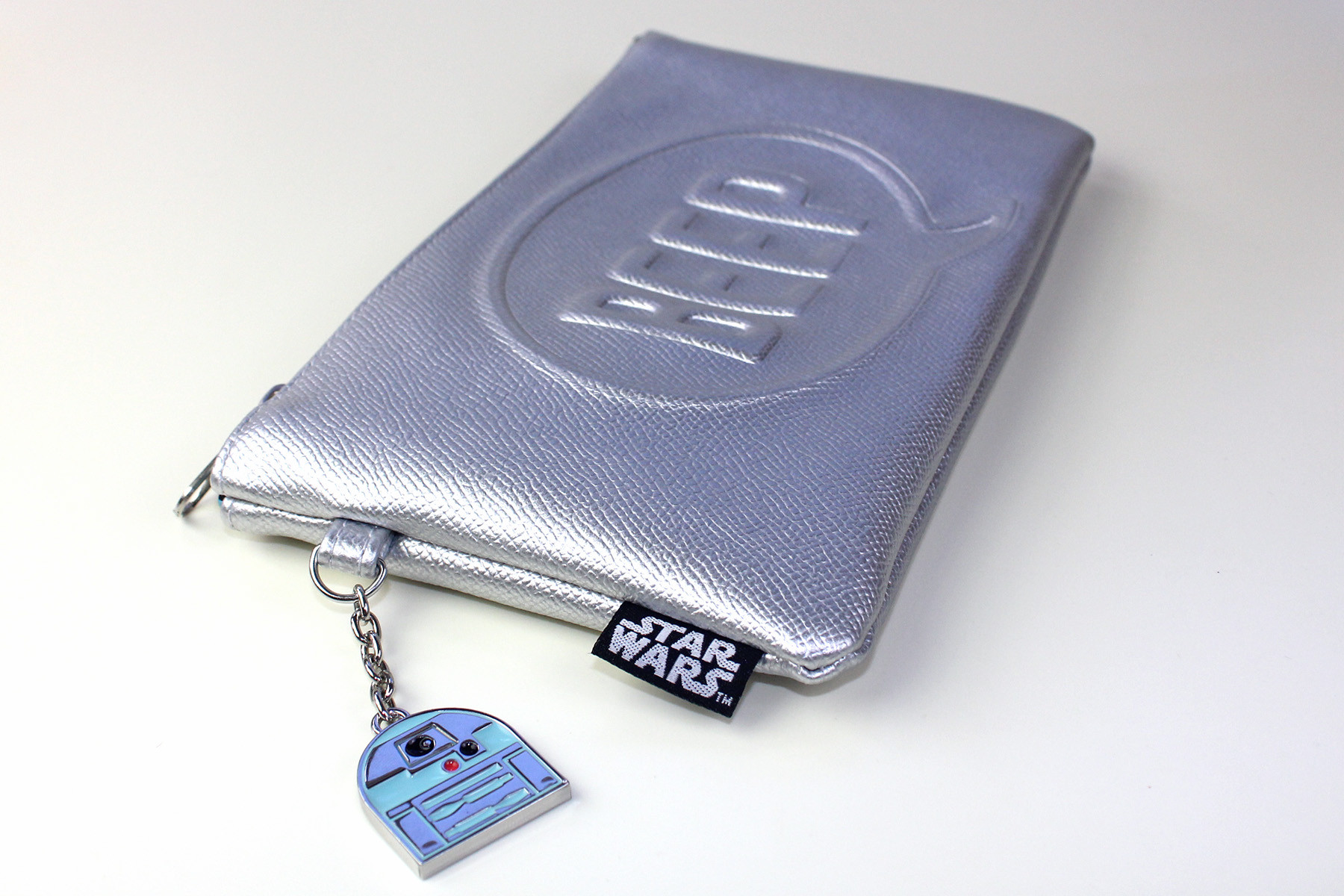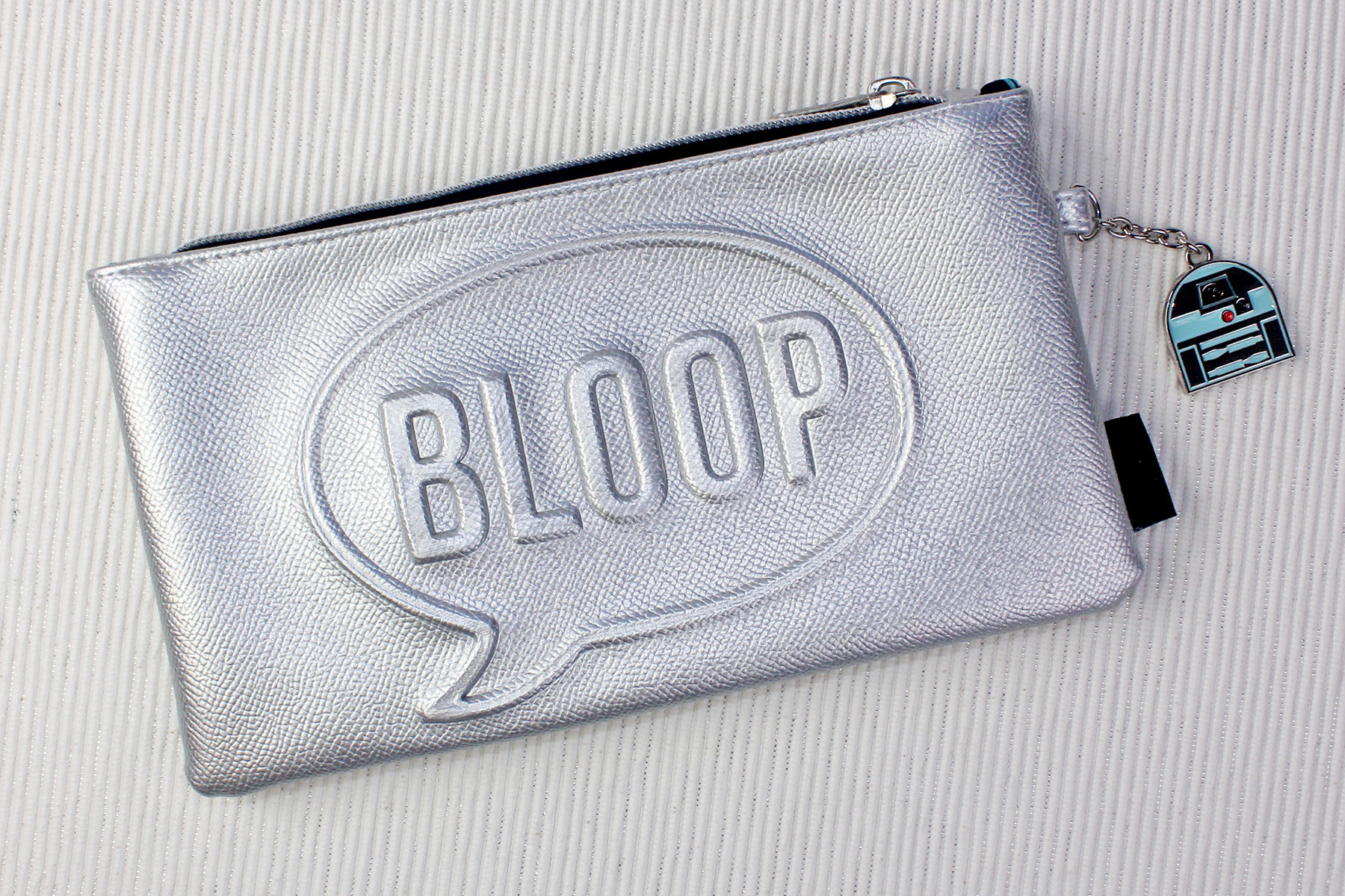The clutch is made from a metallic silver faux leather, which has a visible texture. Both sides feature a ‘debossed’ design, with a raised print. The front features a speech bubble of the word ‘Beep’, while the back features a speech bubble of the word ‘Bloop’ – in reference to R2-D2’s beeping speech pattern. The clutch measures approximately 21.5cm across, and 12cm high.